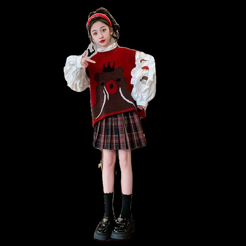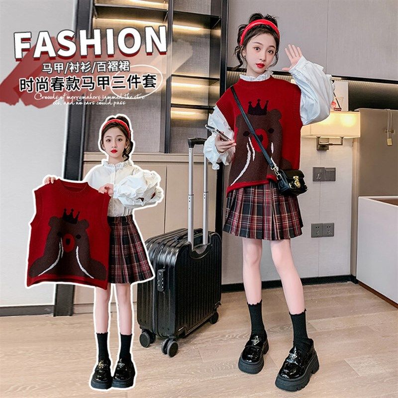 女童春装洋气套装2024新款毛衣马甲裙女宝套裙儿童童装春秋三件套