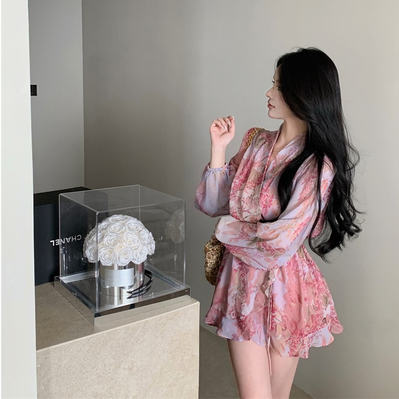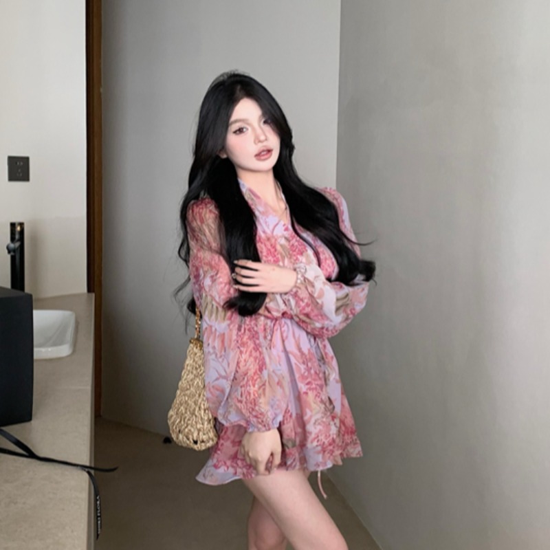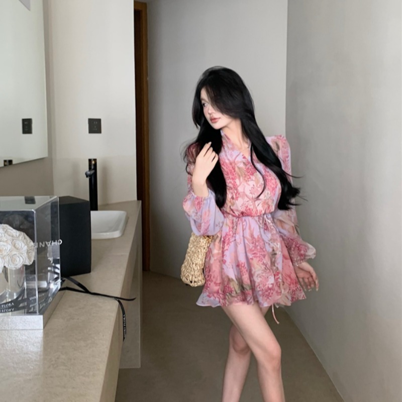 法式浪漫碎花泡泡袖连衣裙女早春季新款度假风荷叶边短裙收腰裙子