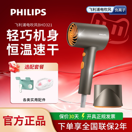 飞利浦电吹风机BHD321家用负离子护发大功率速干新品黑金筒吹风筒