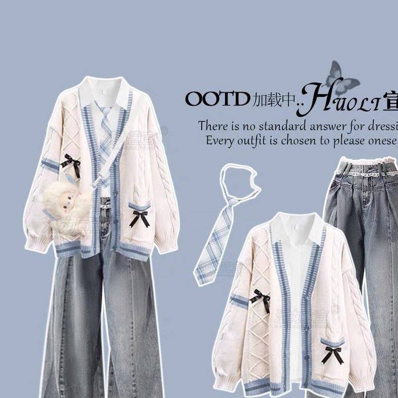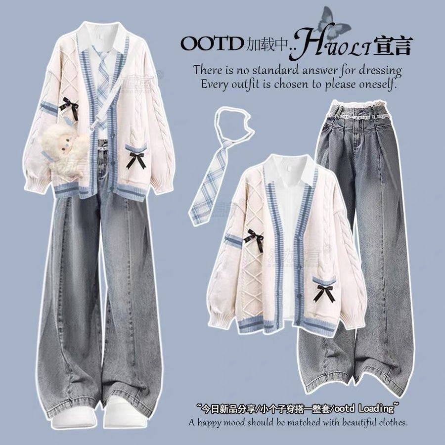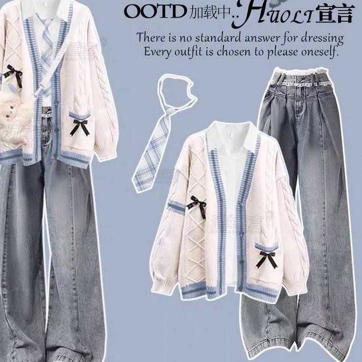 女童秋冬套装2025新款洋气外套时髦马甲针织初中学生牛仔裤三件套