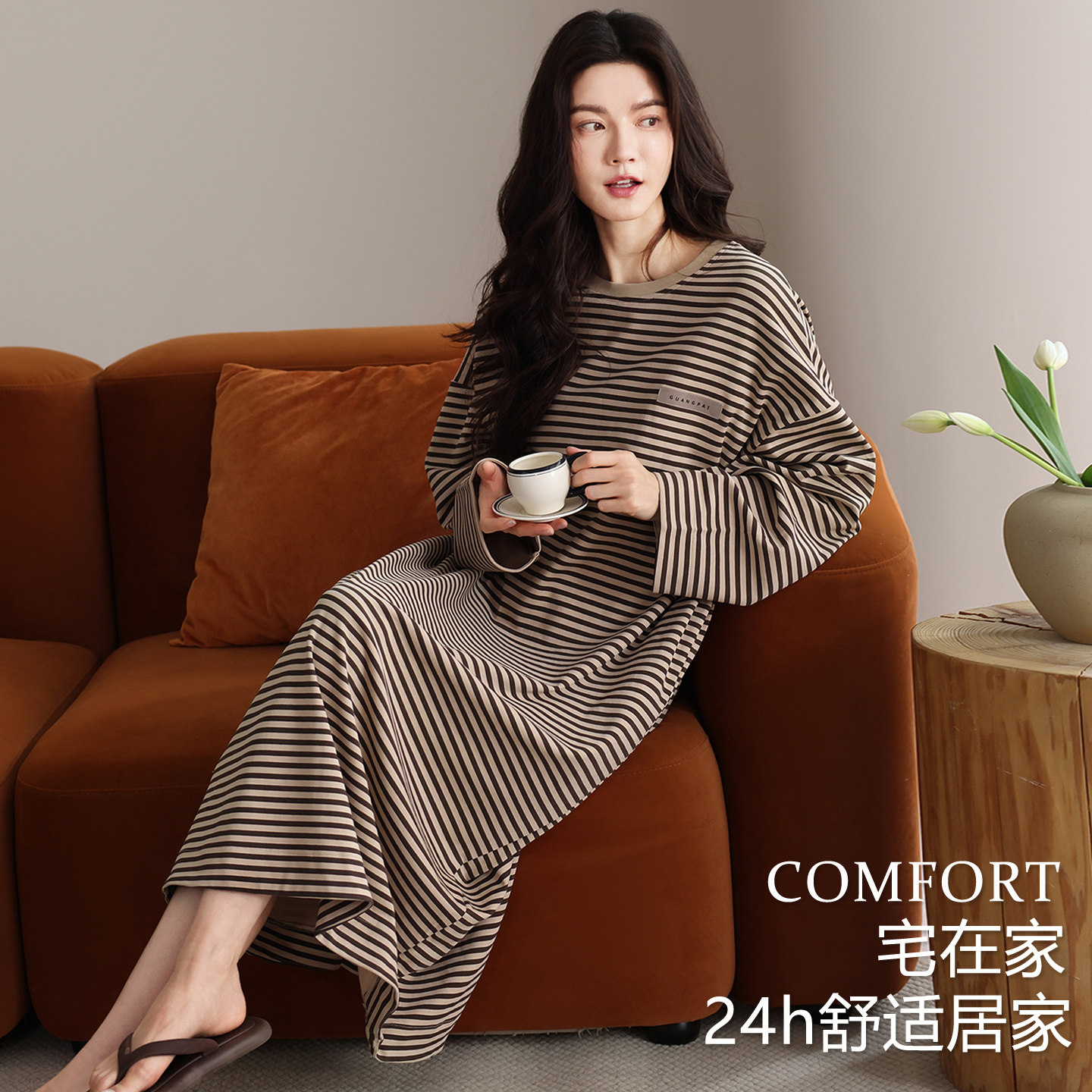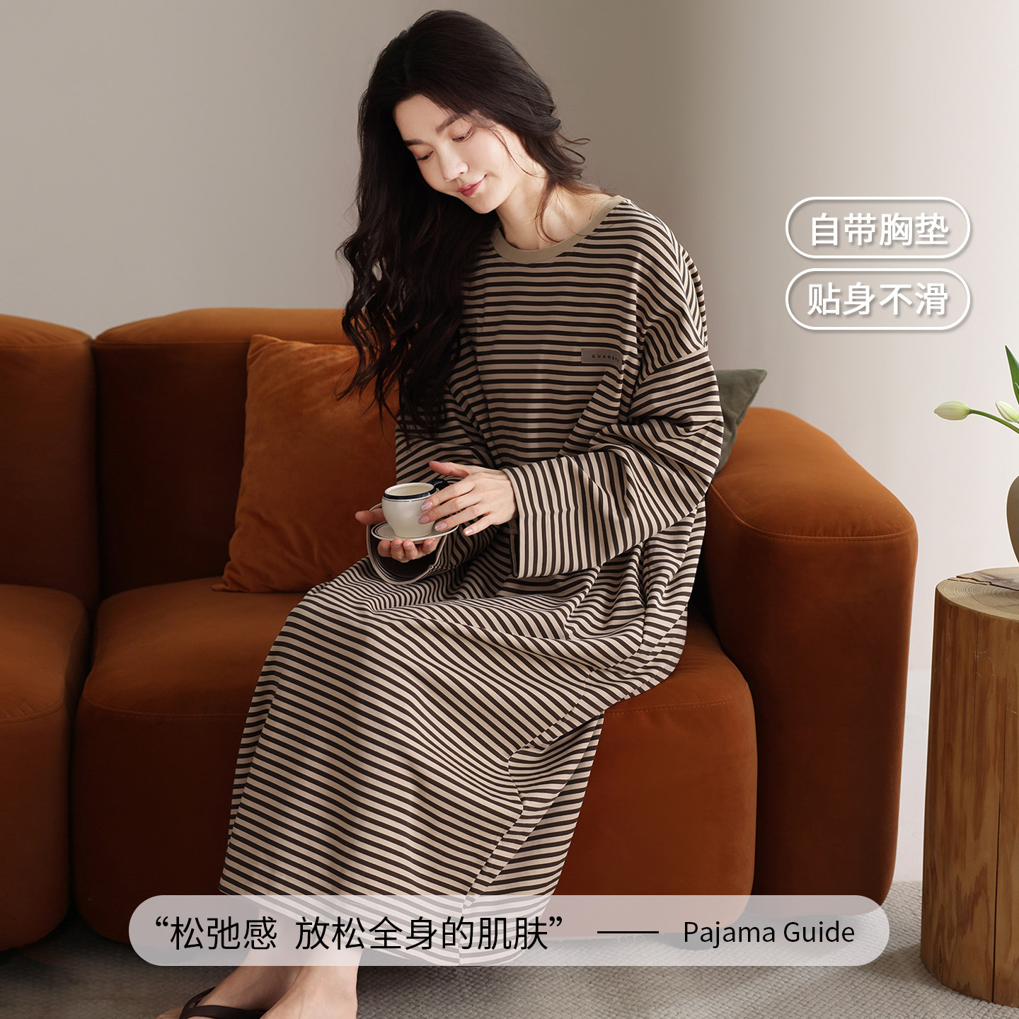 芬腾可安睡裙女款春秋季纯棉长袖女带胸垫2026新款条纹睡衣女冬天
