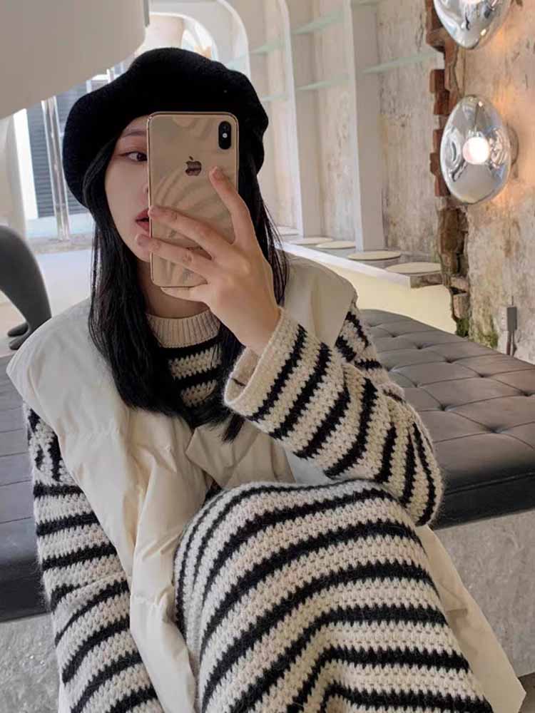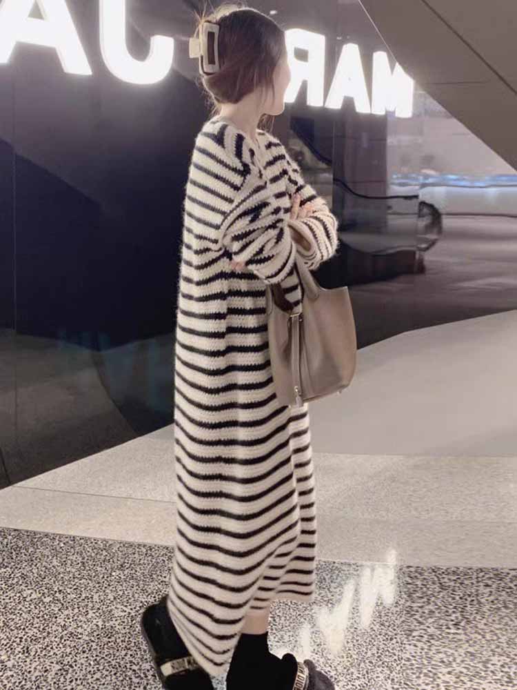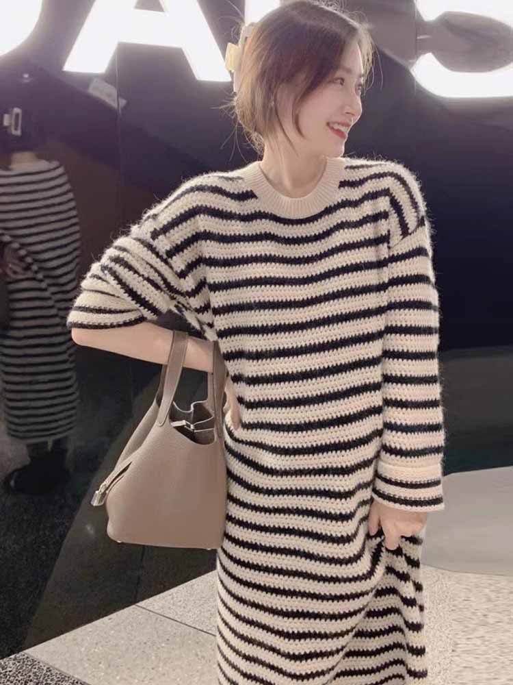 秋冬条纹毛衣裙宽松休闲慵懒风针织连衣裙长款过膝直筒内搭打底衫