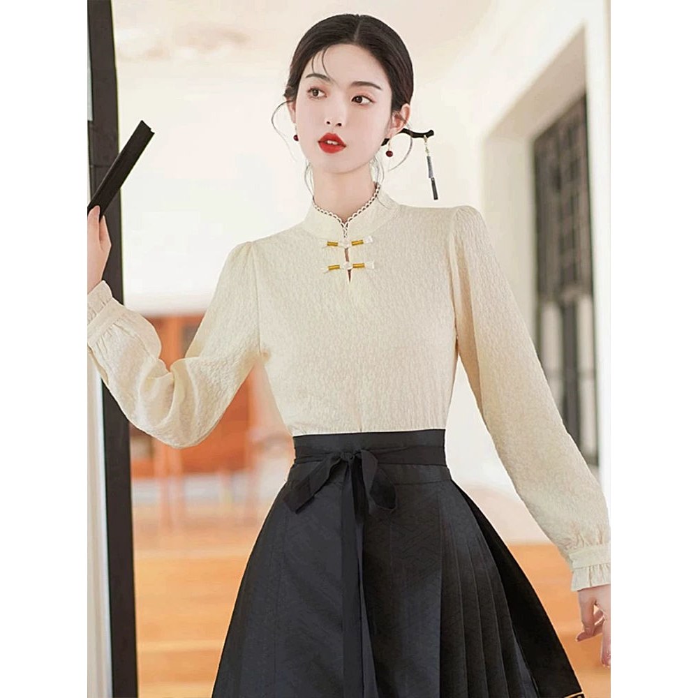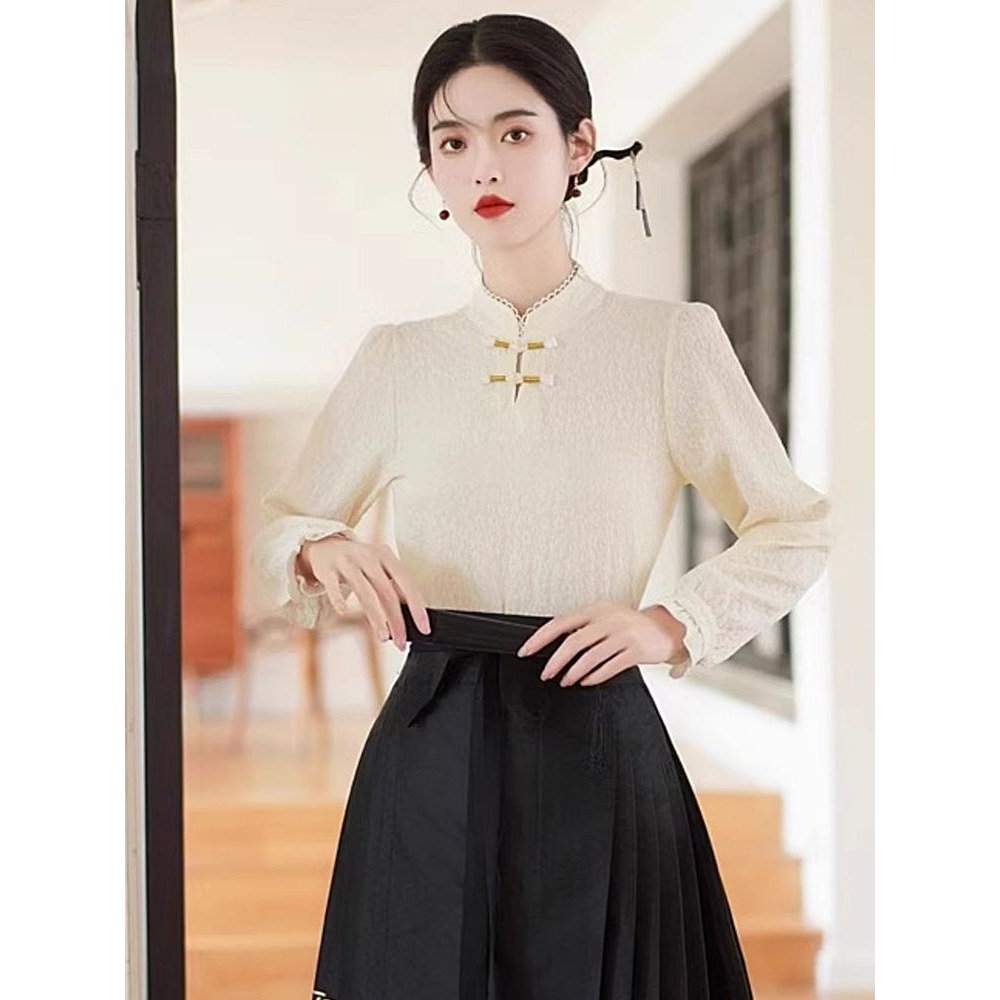 搭配马面裙的衬衫春季新中式国风盘扣汉元素长袖立领对襟上衣女装