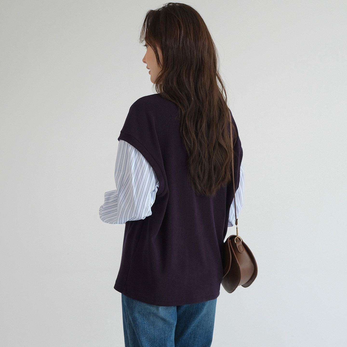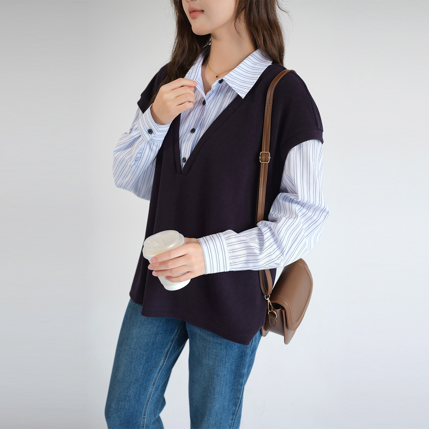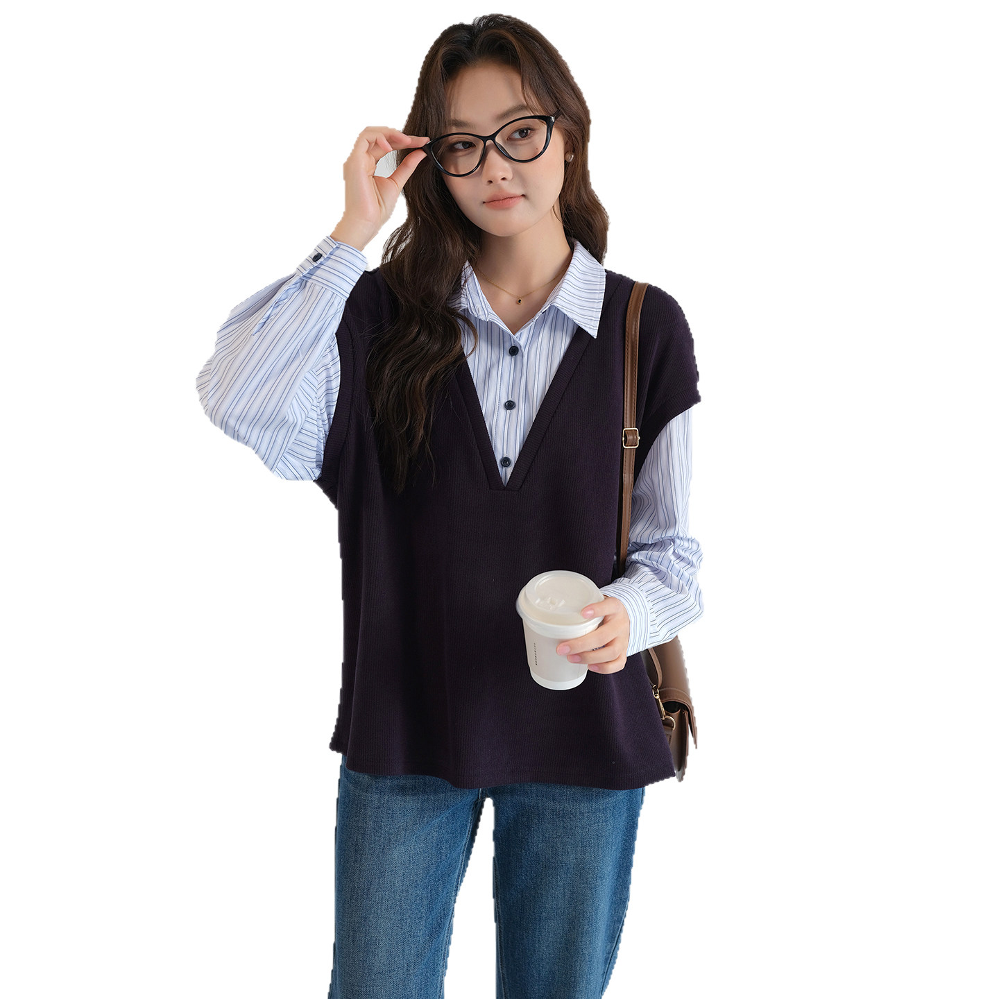 【层次感衬衫马甲假两件】蓝若水大码2026春新款减龄叠穿条纹上衣