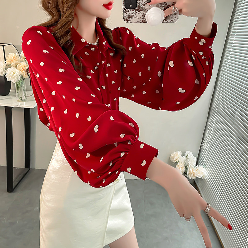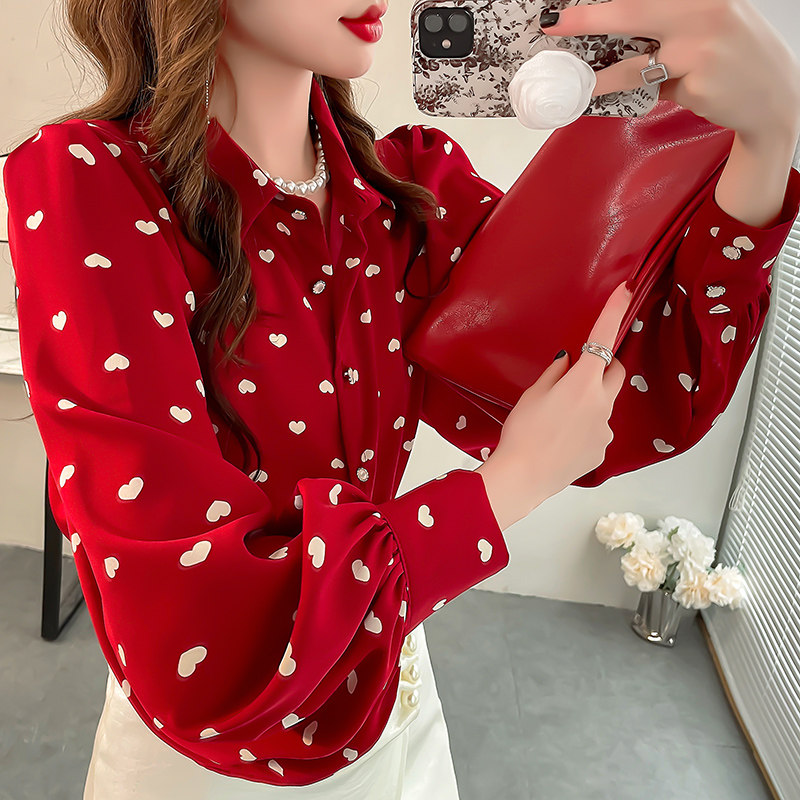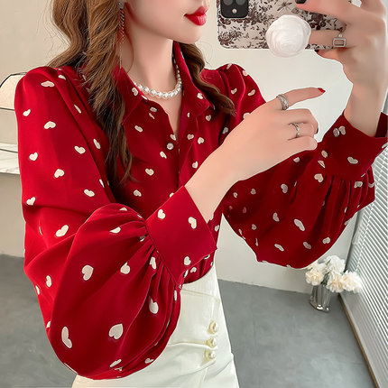 爱心印花红色衬衫女高级感轻奢减龄洋气衬衣显瘦灯笼袖雪纺上衣秋