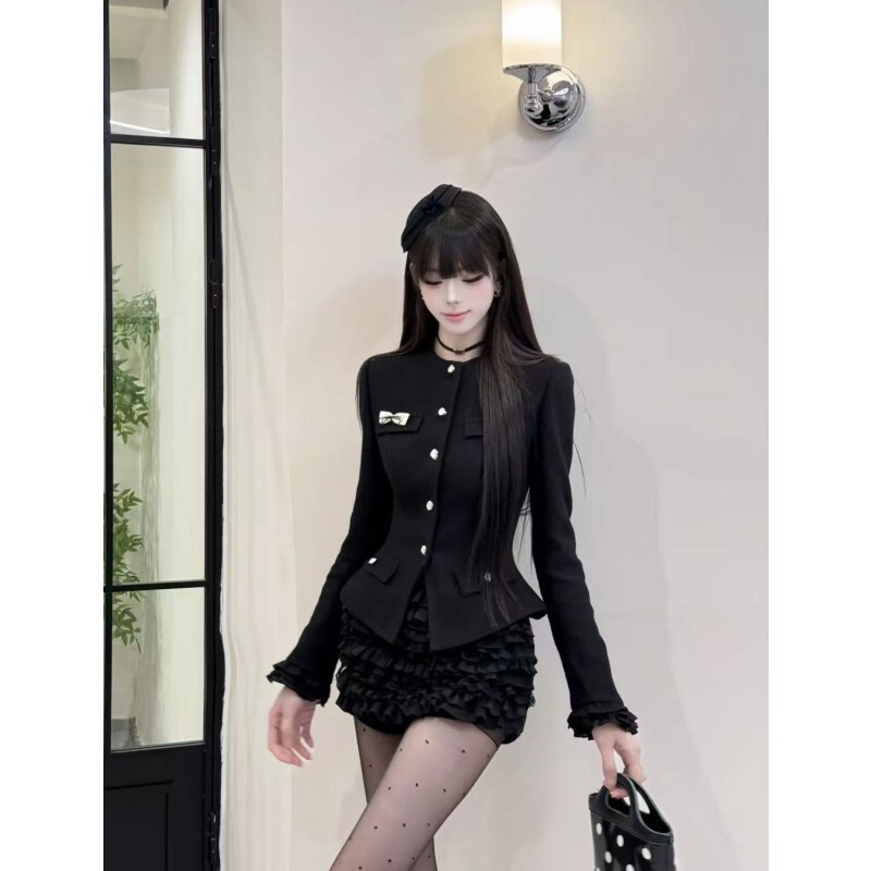 千金感小香风黑色套装女秋冬气质名媛时尚双排扣上衣短裙两件套裙