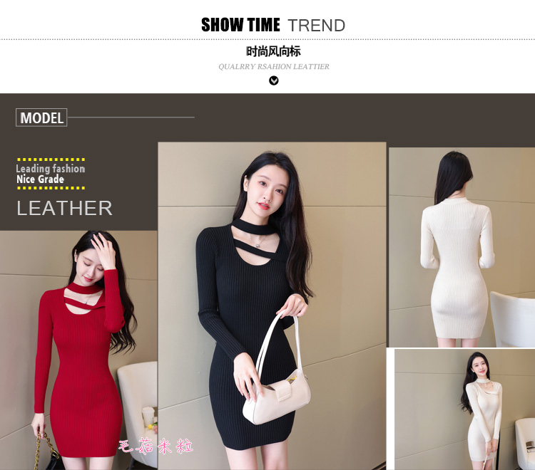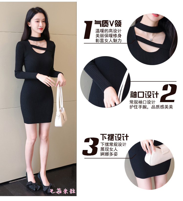 针织连衣裙女秋冬修身显瘦挂脖气质配大衣的的内搭中长款打底裙子