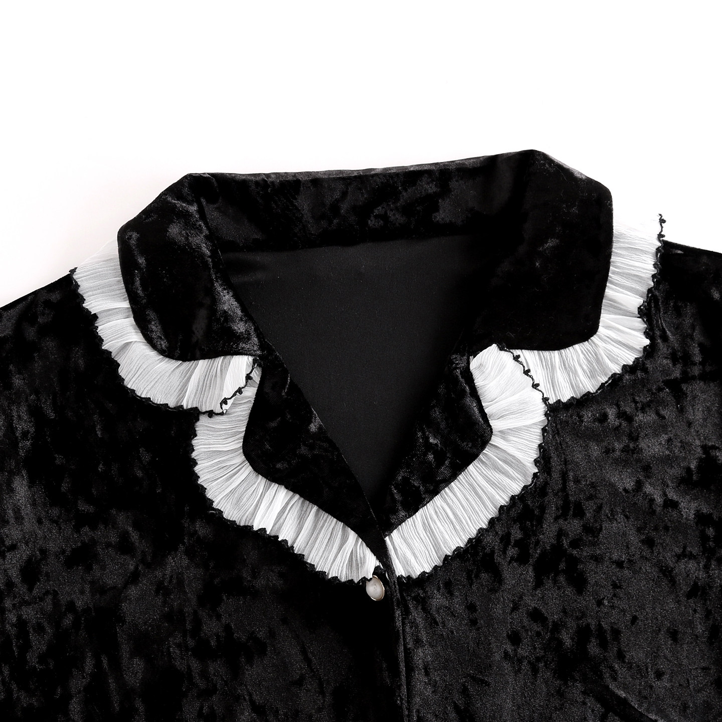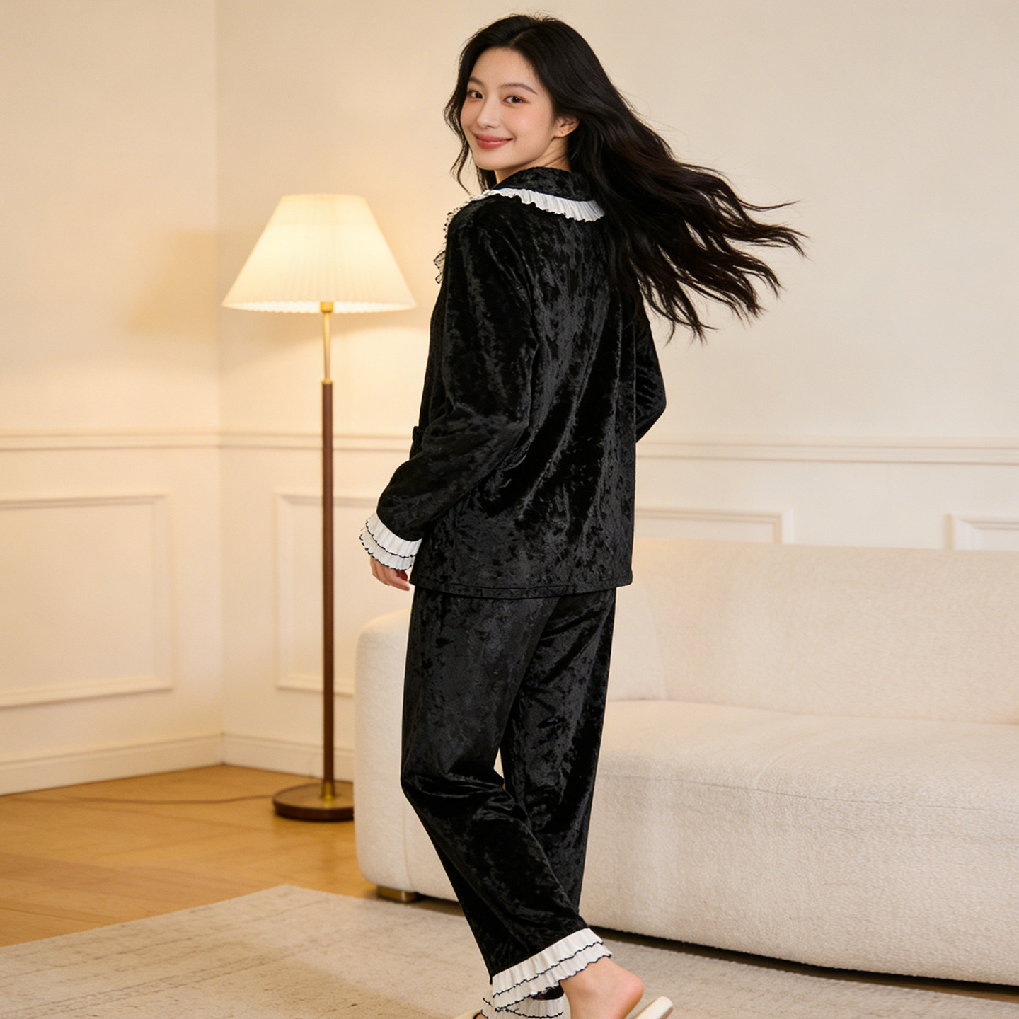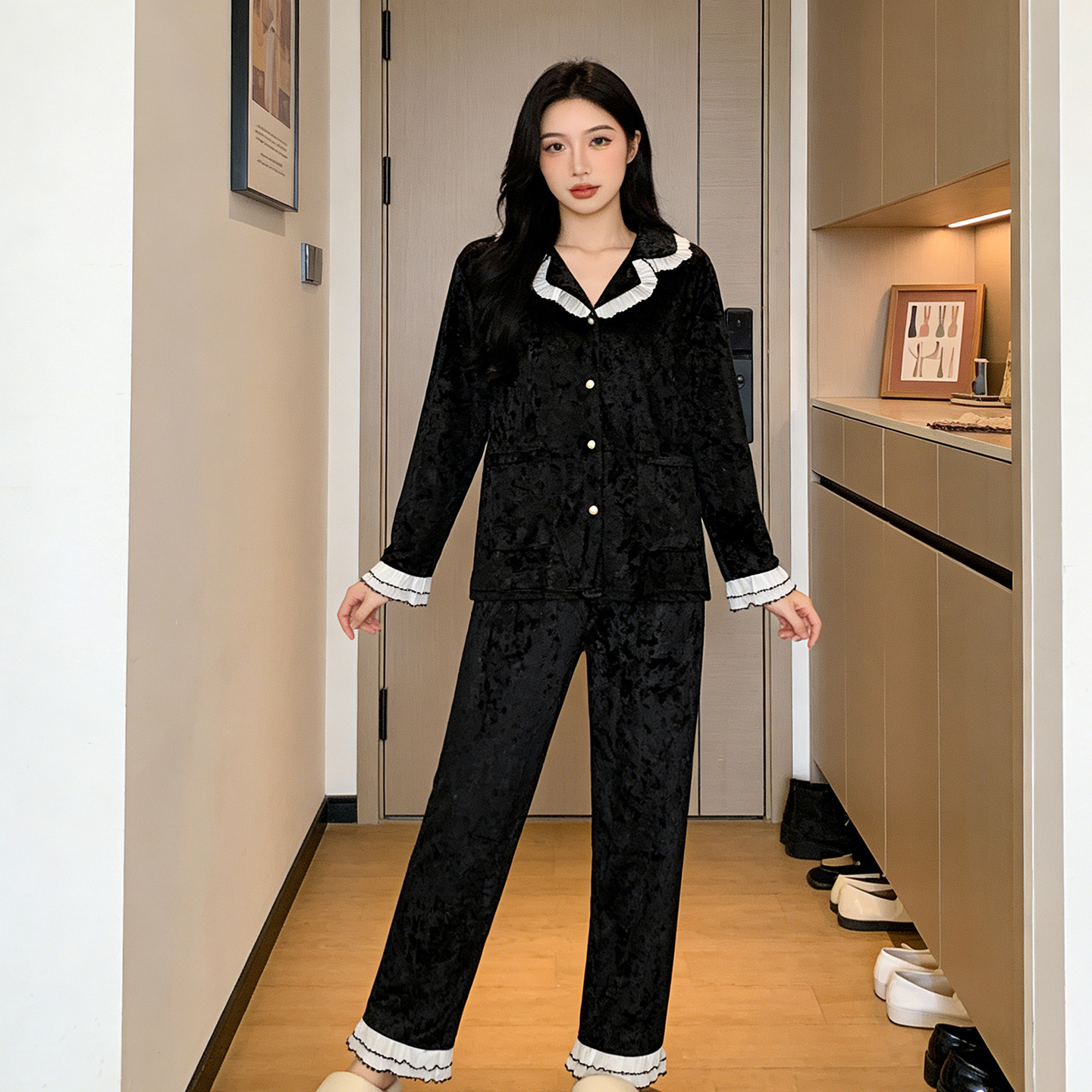 轻奢时尚金丝绒睡衣女秋冬季高级感花边黑色休闲家居服套装可外穿