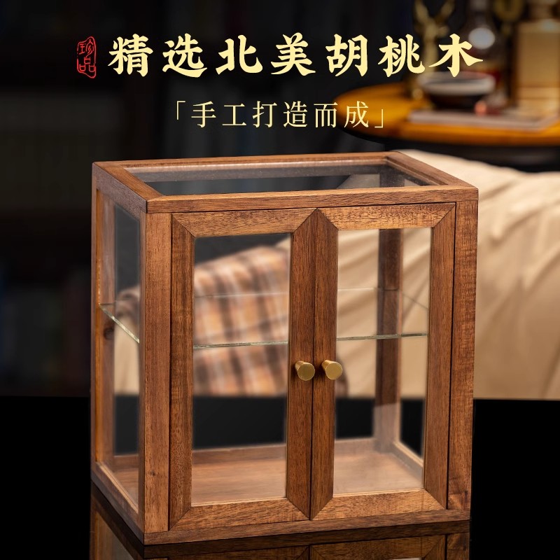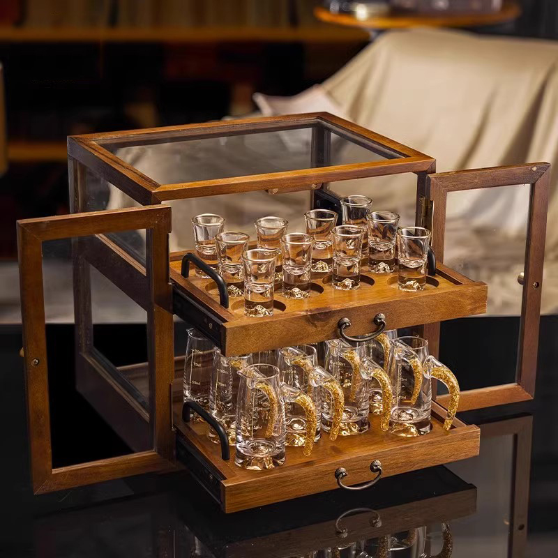 中式家用水晶玻璃白酒杯套装双层胡桃木盒子轻奢高档分酒器子弹杯