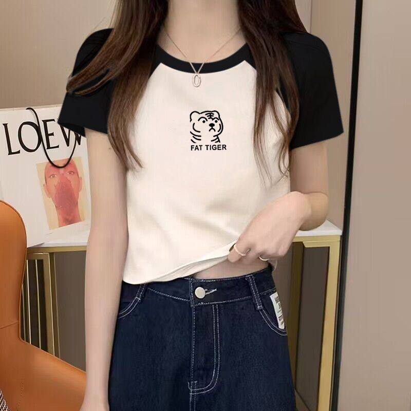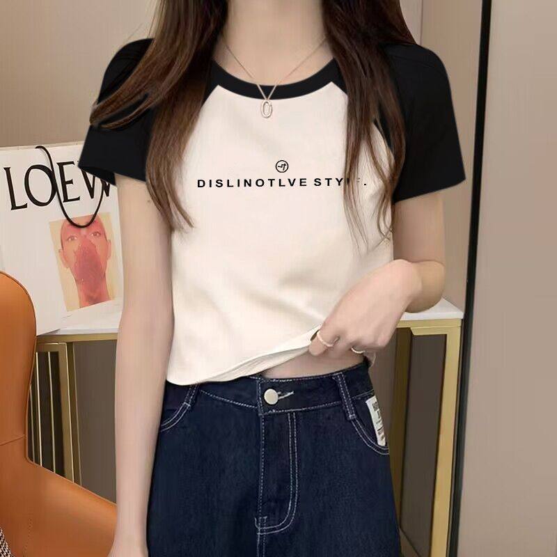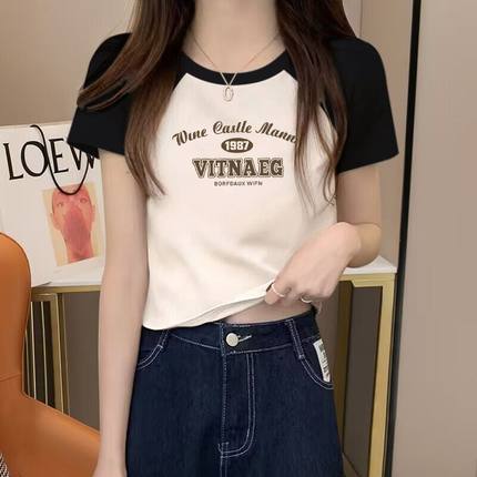 正肩撞色短袖t恤女上衣短款宽松夏季2025新款洋气卡腰小众设计感