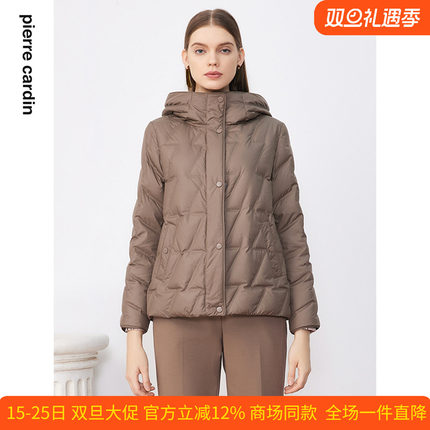 商场同款皮尔卡丹女装羽绒服咖色菱形格状百搭连帽保暖上衣