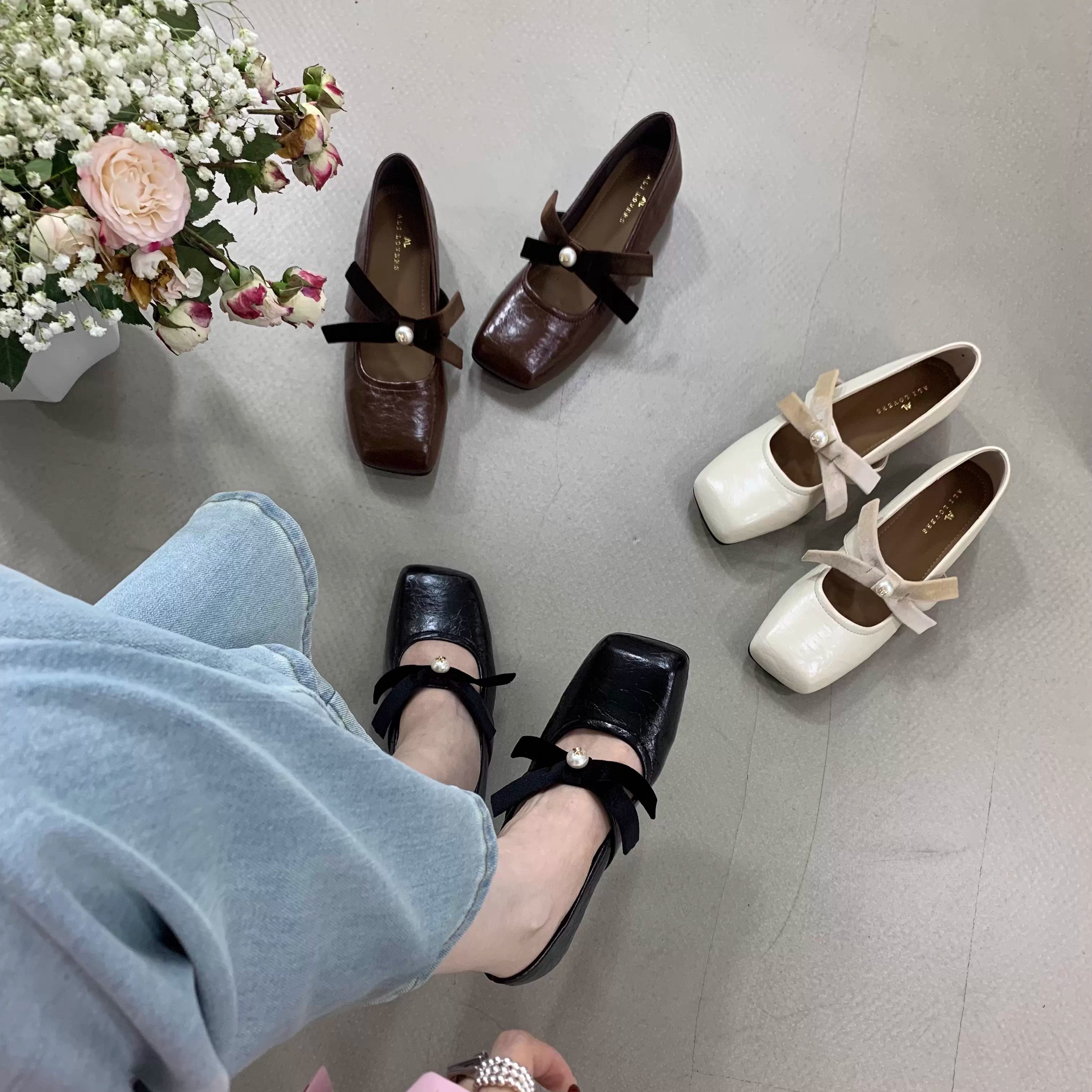 方头蝴蝶结浅口单鞋女内增高一字带珍珠百搭通勤鞋真皮软底奶奶鞋