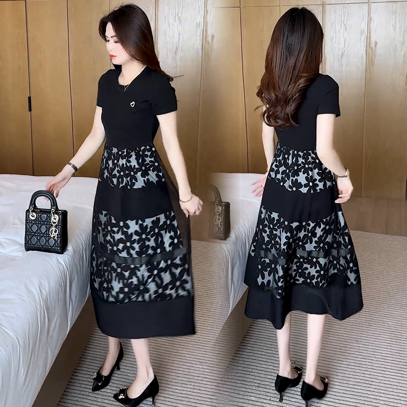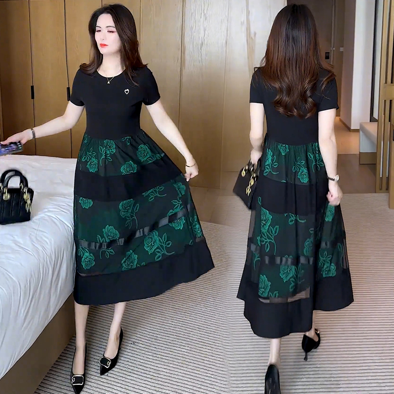 时尚大码连衣裙女2025夏季新款洋气显瘦拼接网纱宽松遮肚子中长裙