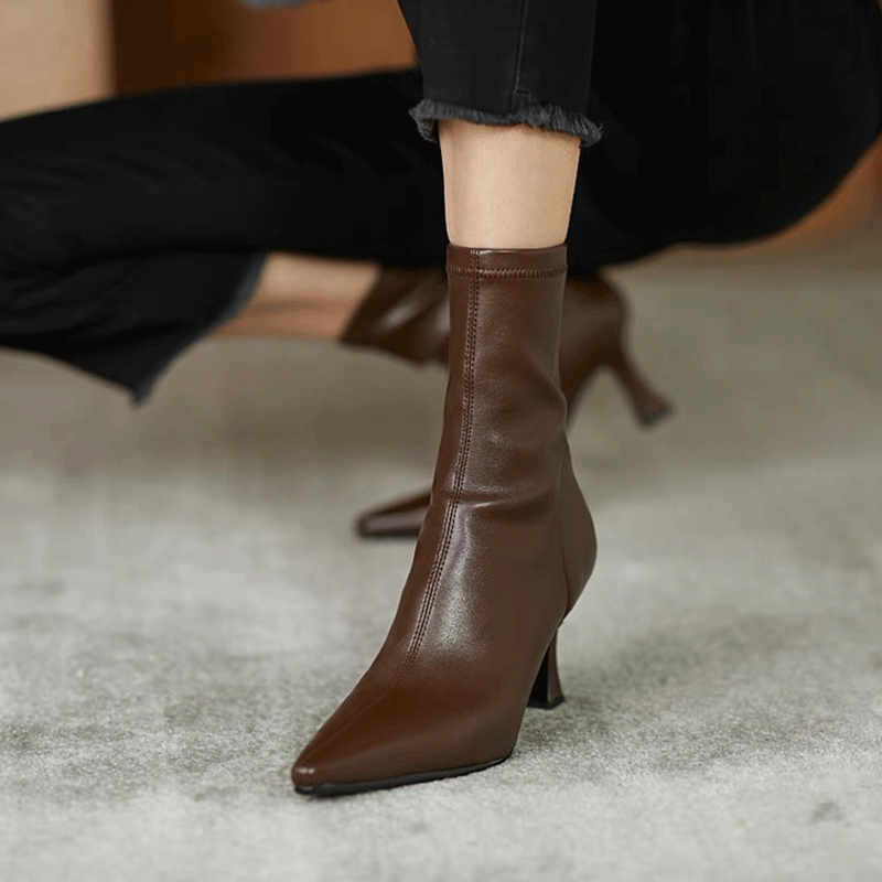 2025新款法式棕色短靴女粗跟马丁靴百搭尖头气质高跟靴中筒弹力靴
