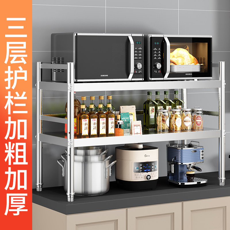 带围栏不锈钢厨房置物架微波炉架家用收纳架多功能储物架层架橱柜