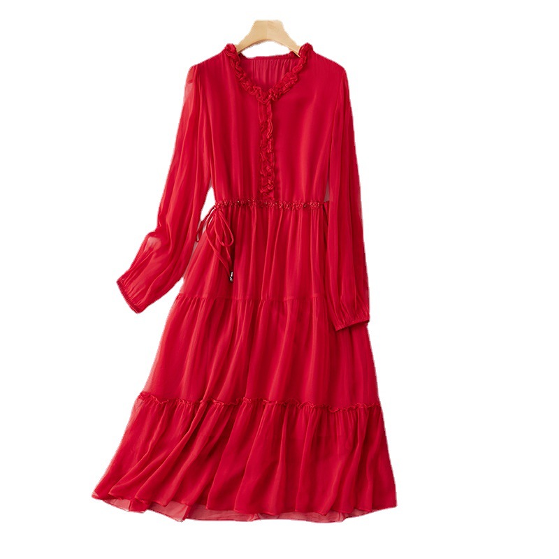 微米级手感!优雅红色真丝连衣裙