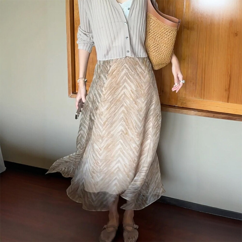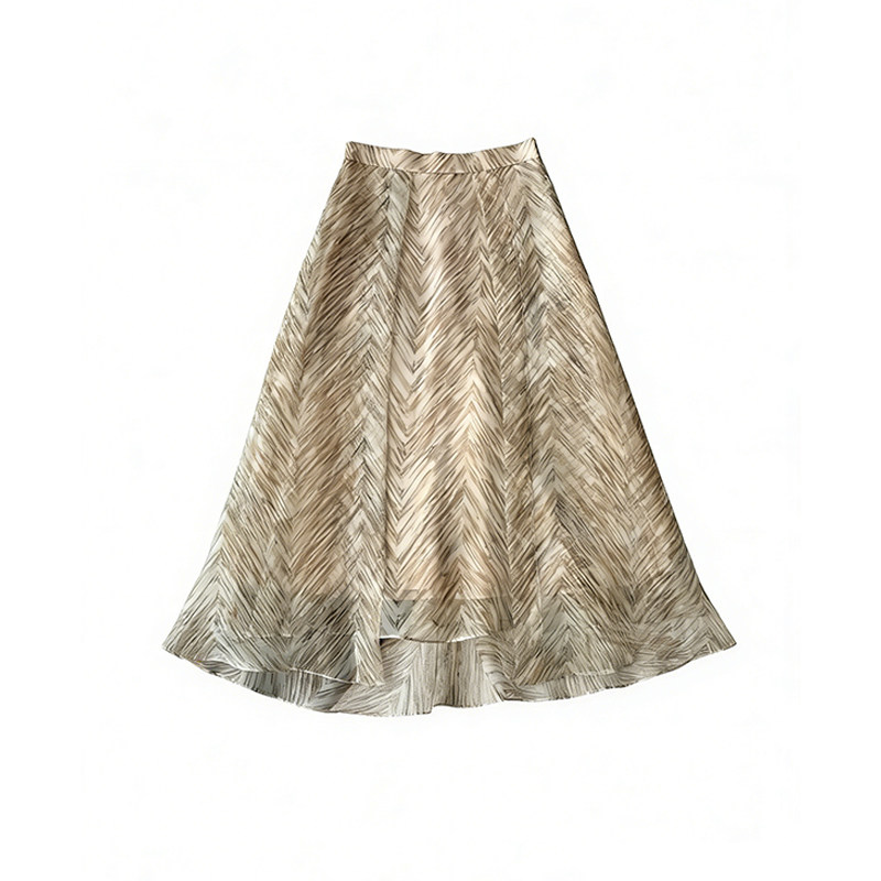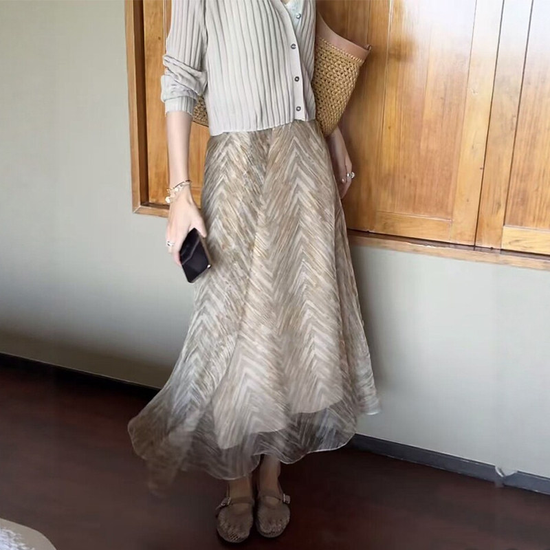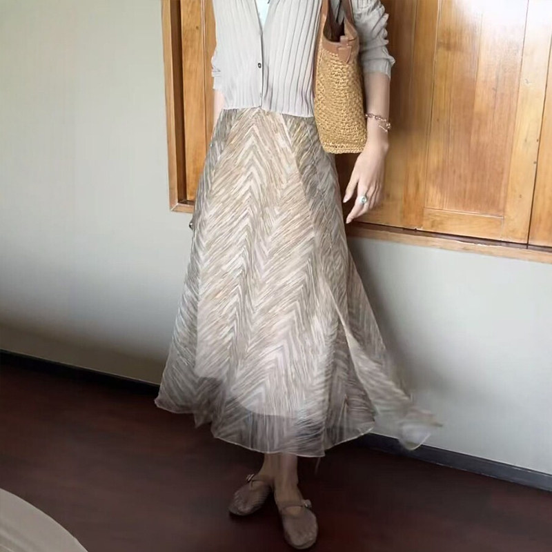 老钱风欧根纱印花半身长裙大码女装鱼骨纹雪纺网纱梨形伯克利裙子
