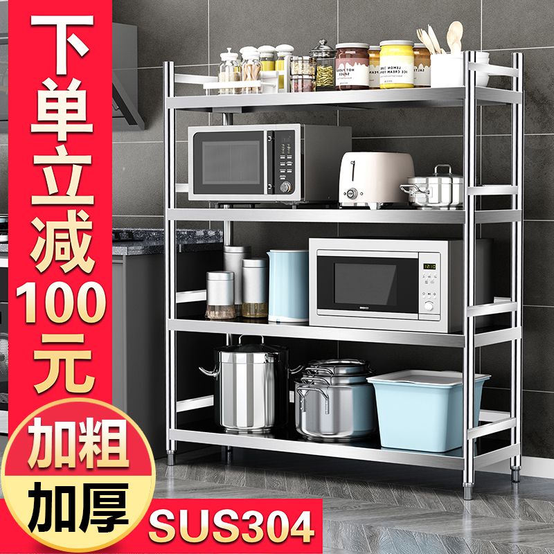 四层304不锈钢厨房置物架带围栏收纳微波炉层架3o4钢落地储物货架