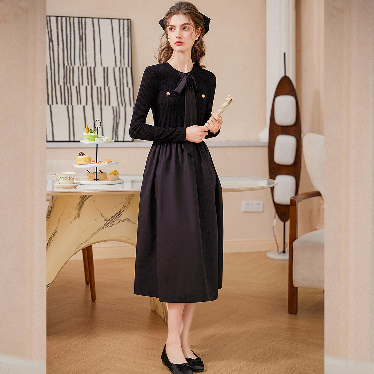 白鹿语针织拼接修身长裙25秋新款通勤气质圆领系带收腰正肩连衣裙
