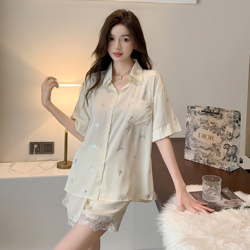 男友风睡衣女夏季短袖短裤性感冰丝绸薄款夏天可外穿家居服套装