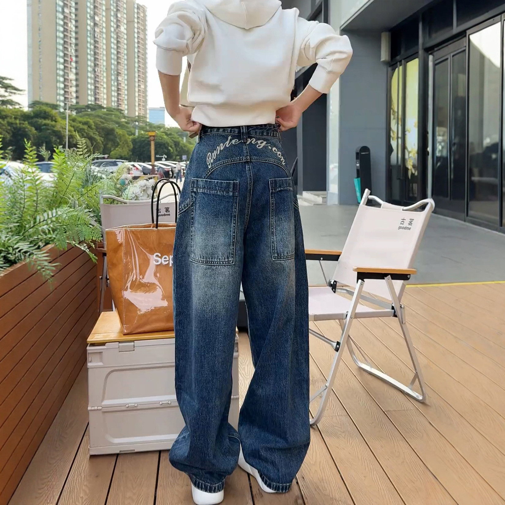 大码加绒牛仔裤女秋冬季2025新款美式直筒阔腿裤胖mm显瘦弯刀裤子