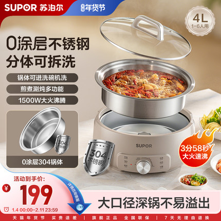 苏泊尔电火锅家用0涂层大火力分体可拆多功能4L大容量速沸料理锅