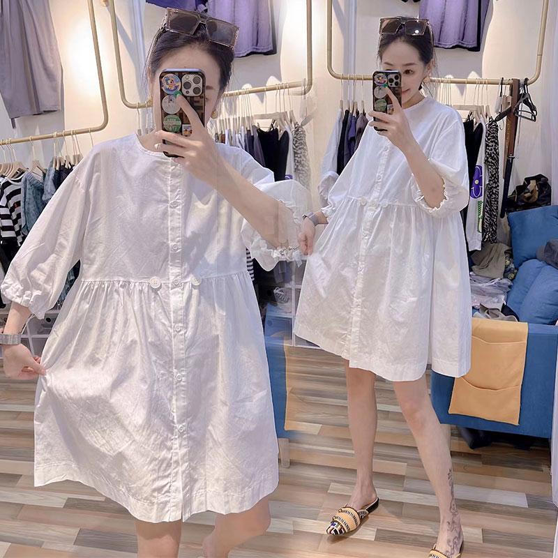 300斤大码欧货夏新款韩版宽松纽扣开衫圆领净版中长款半袖连衣裙