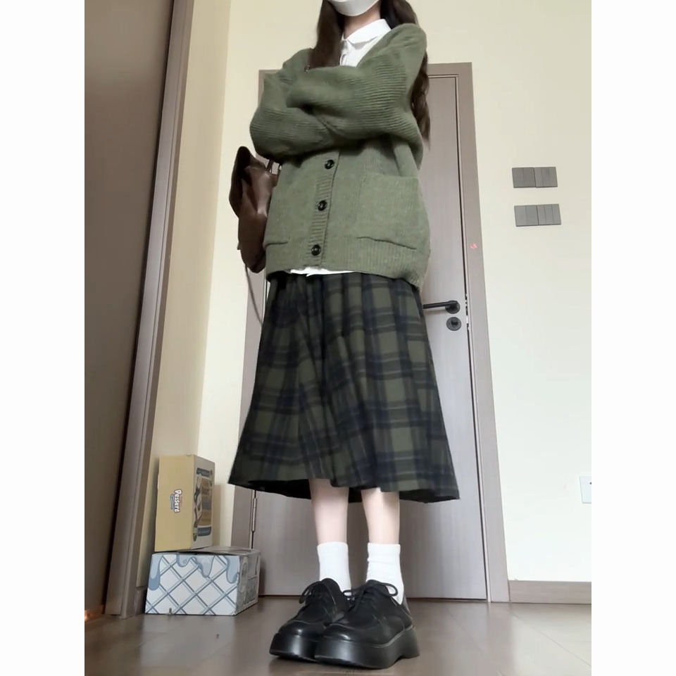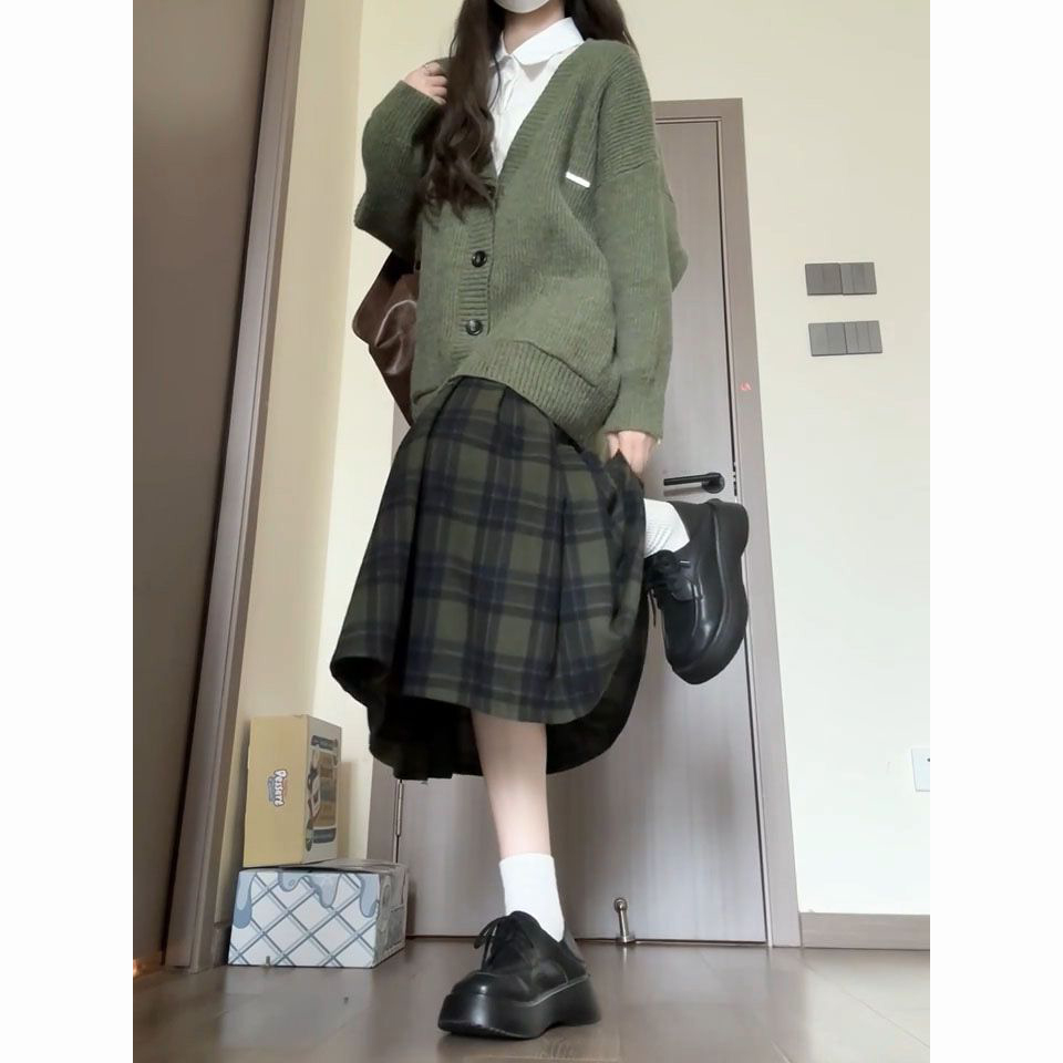 2025早秋气质温柔风绿色毛衣开衫+白色衬衫+格子半身长裙两件套装