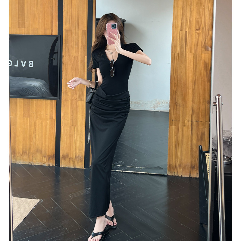 女装春季150cm显高加小码XXXS小个子短袖长裙时尚裙连衣裙v领褶皱