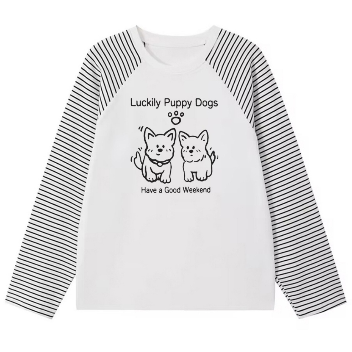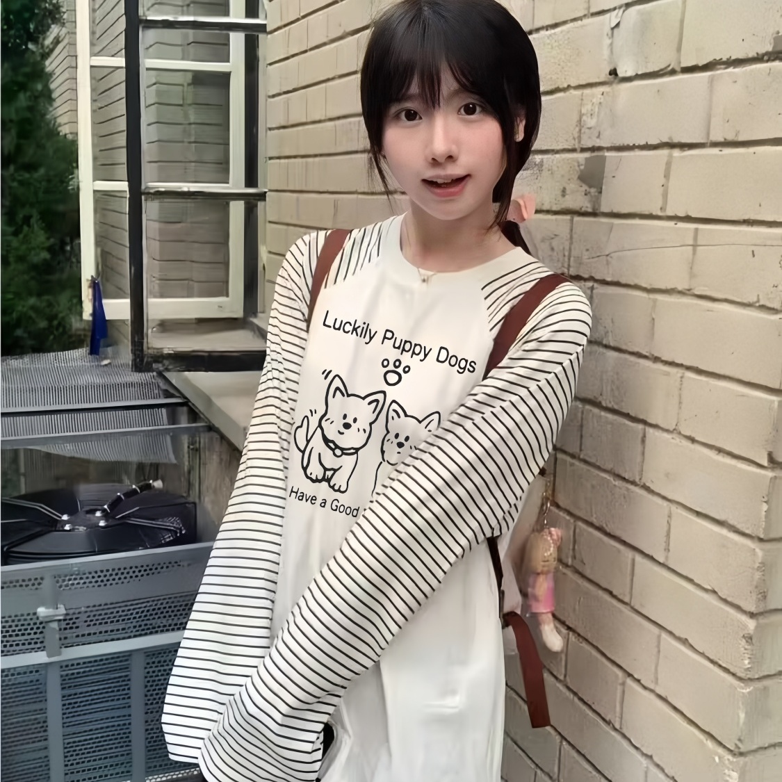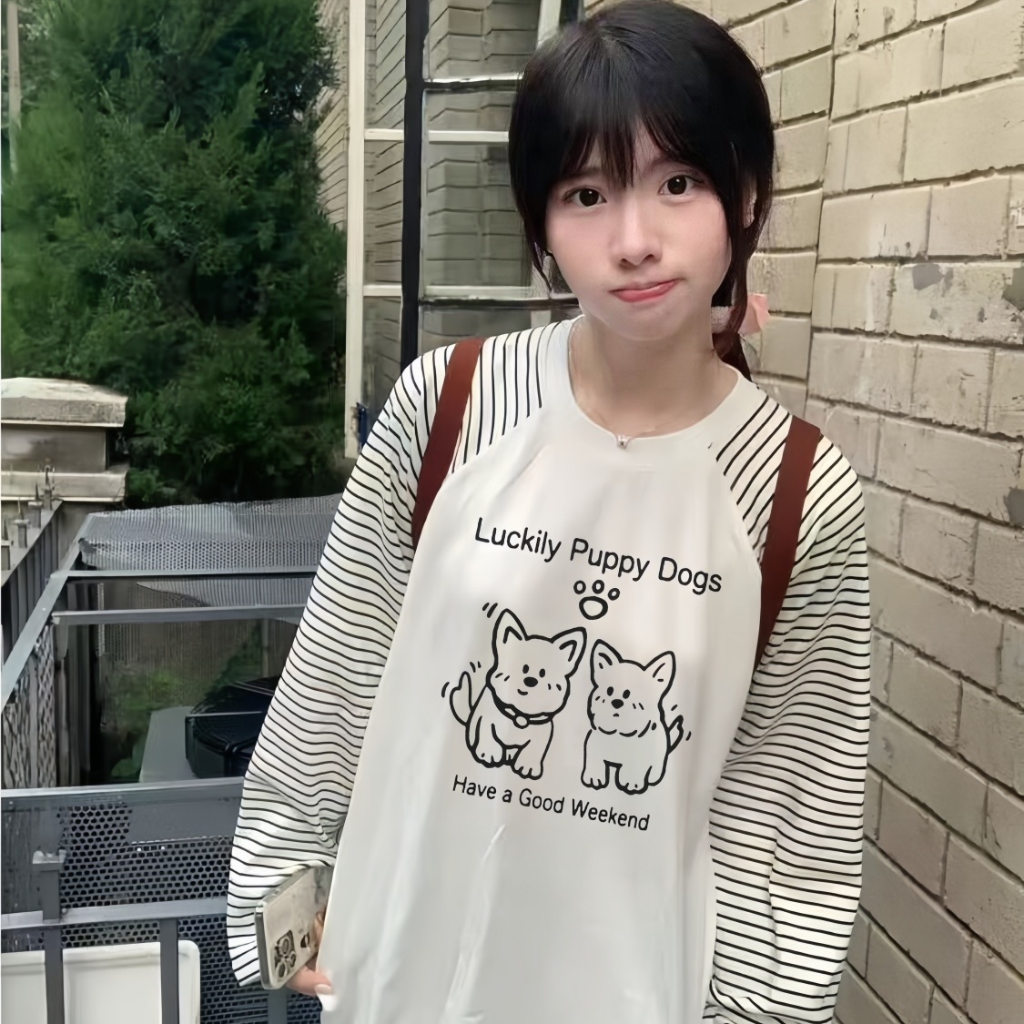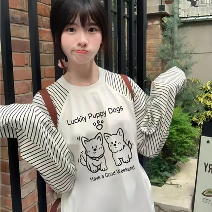 百搭宽松简约条纹长袖T恤女秋冬季可爱印花学生小个子打底衫上衣