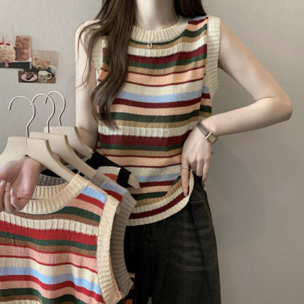 针织吊带背心女外穿夏季打底内搭复古彩虹条纹坎肩无袖t恤上衣潮