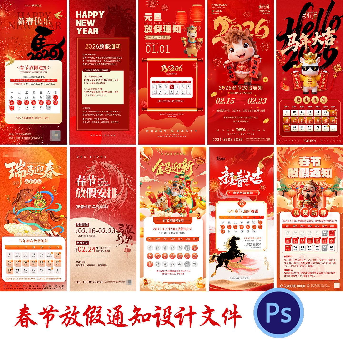 2026新年马年春节除夕正月公司企业放假通知公告海报PSD素材模板