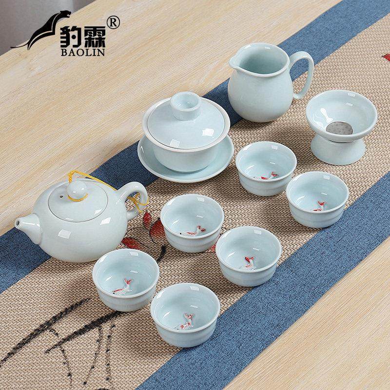 龙泉陶瓷青瓷功夫茶具套装家用品泡茶杯盖碗组合现代简约禅青花瓷