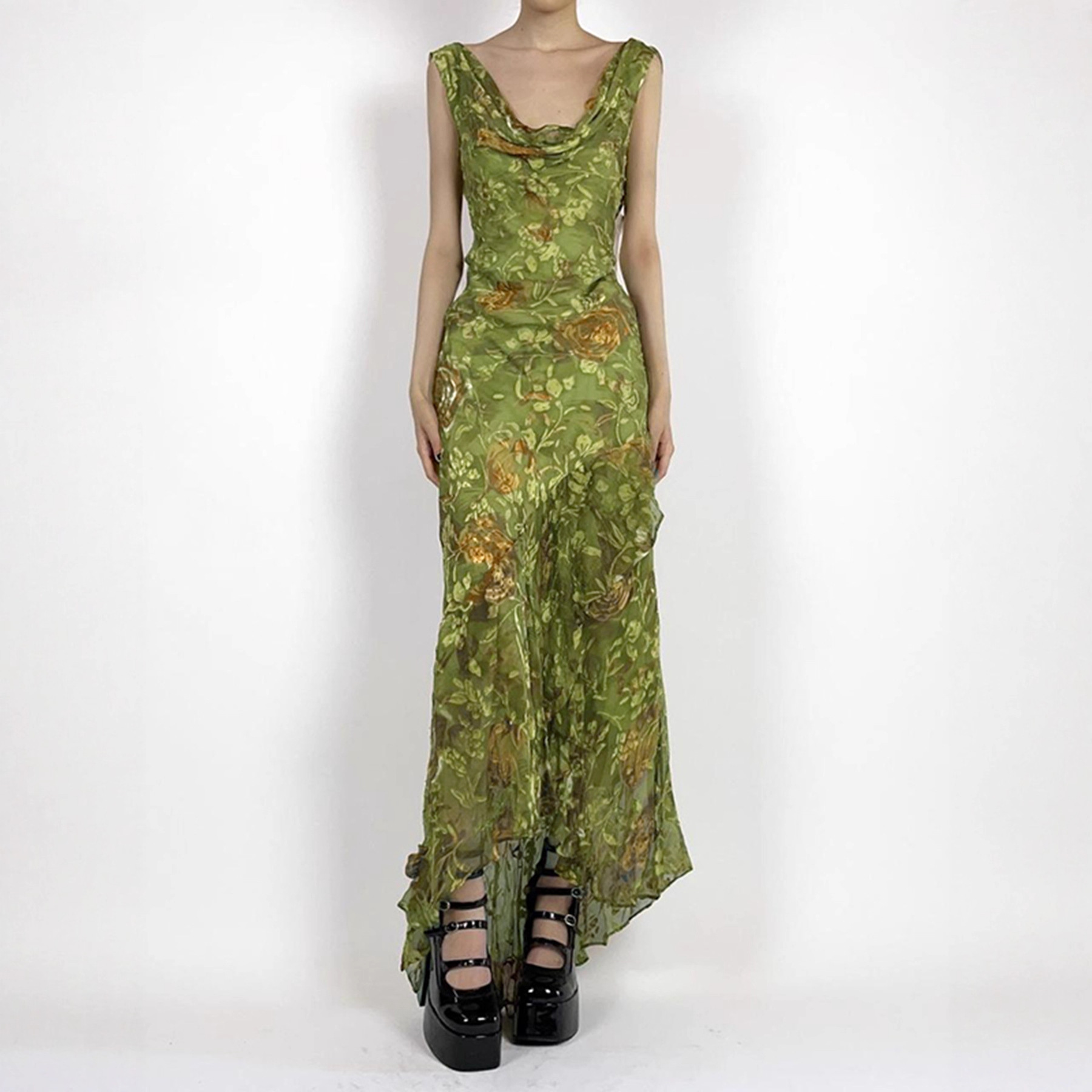 小众设计复古印花撞色性感荡领露背优雅网纱拼接无袖背心连衣裙新
