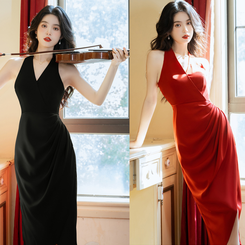 法式温柔风中长款收腰性感v领吊带连衣裙女复古港风气质褶皱长裙