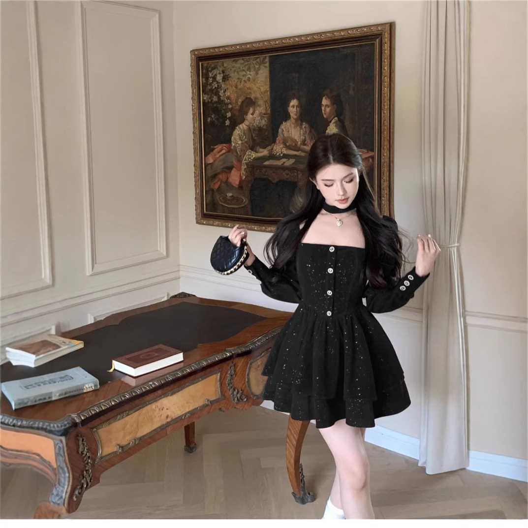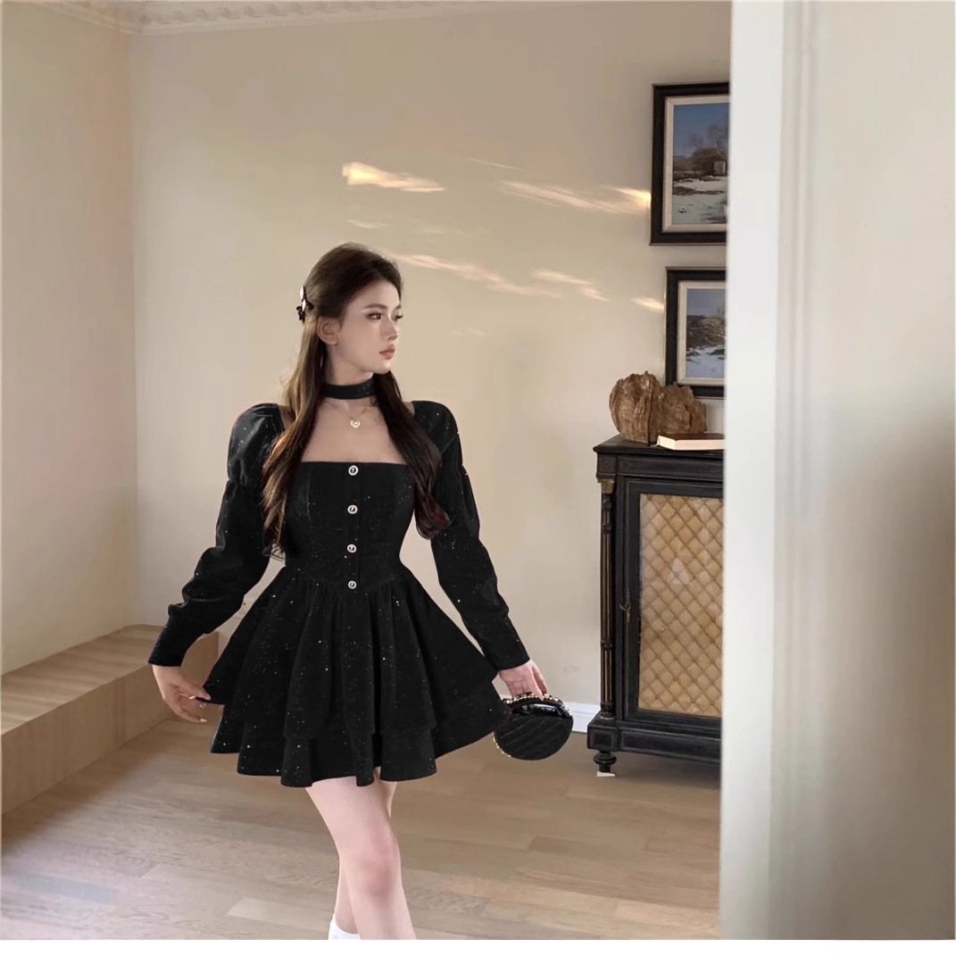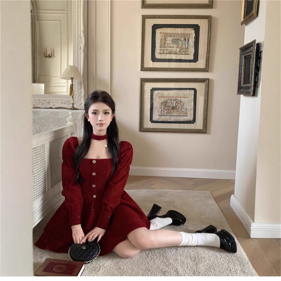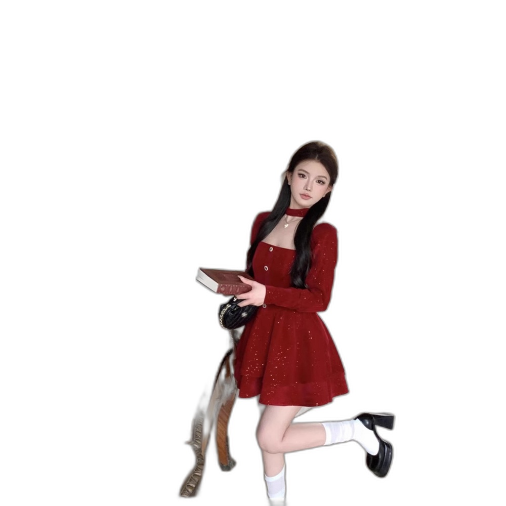 芭比跨年战衣红色挂脖连衣裙女秋冬丝绒公主生日小礼裙新年裙子姨