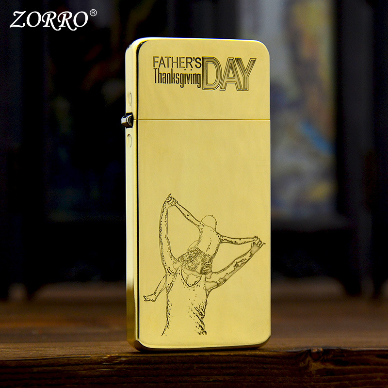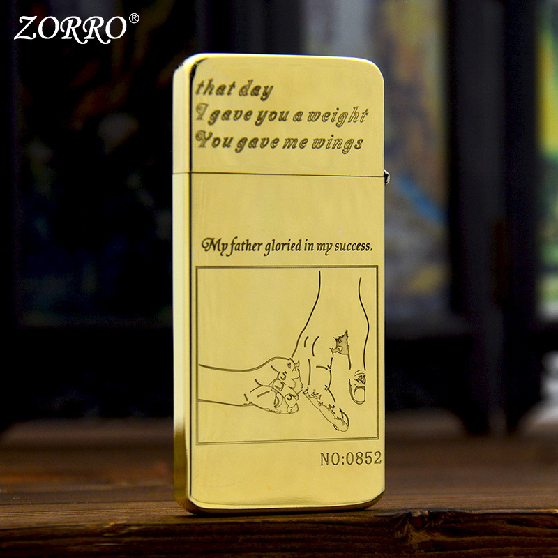 ZORRO佐罗正品纯黄铜金色超薄窄款砂轮煤油打火机雕刻图父爱如山B