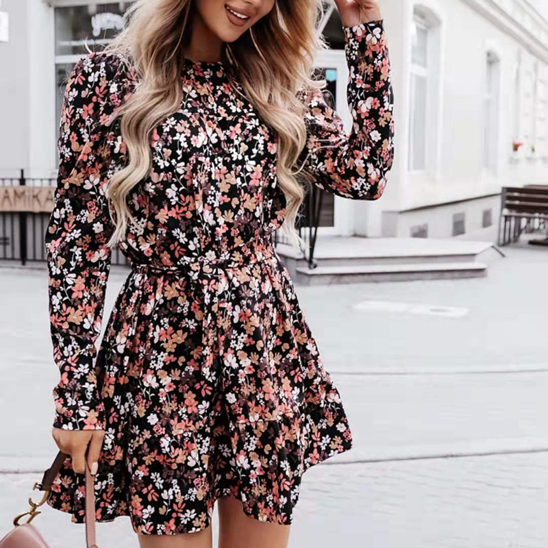 欧美风甜美秋小花碎花裙荷叶边泡泡袖收腰系带长袖连衣裙子dress