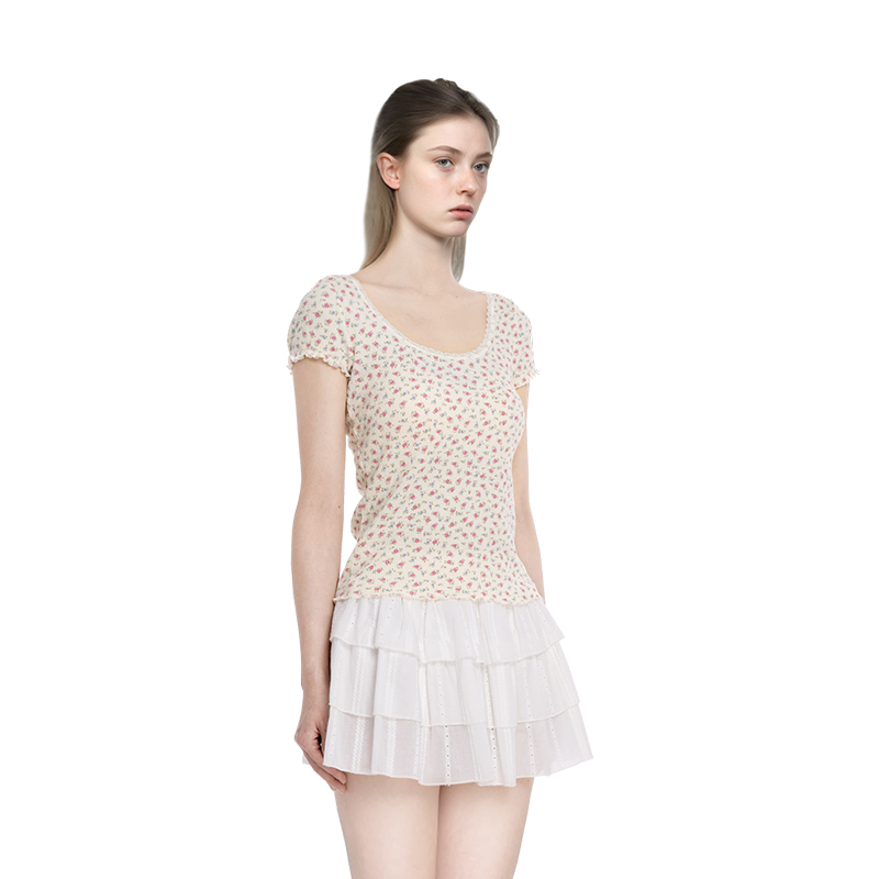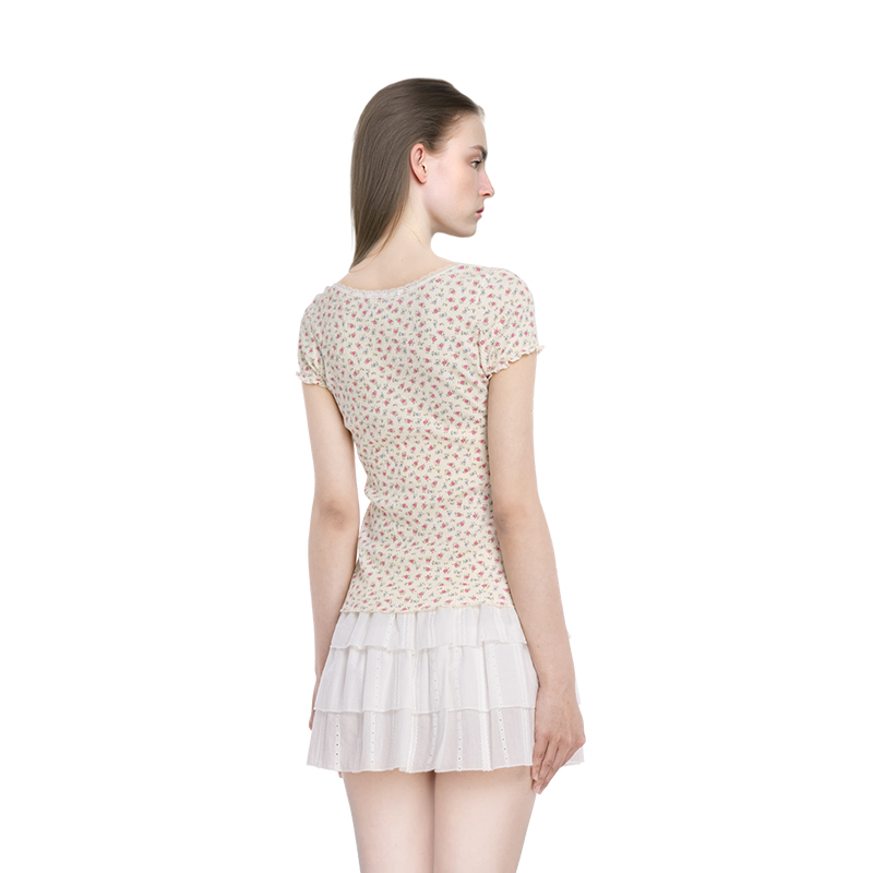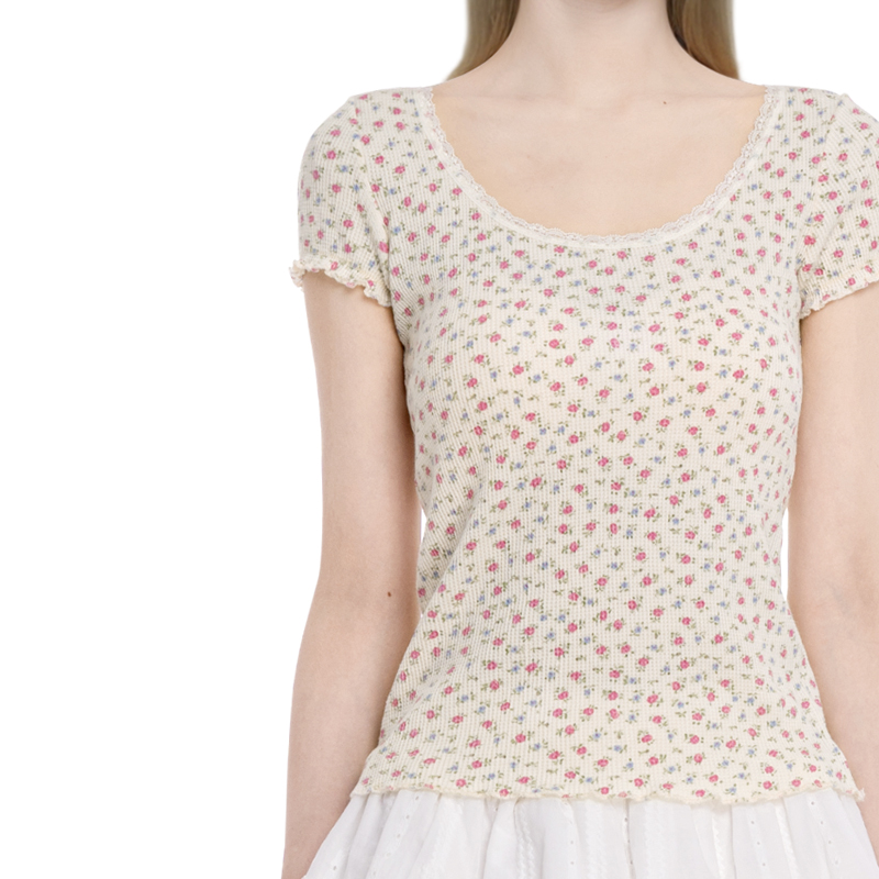 BM短袖女2025新款夏季华夫格碎花圆领蕾丝边t恤修身显瘦百搭上衣