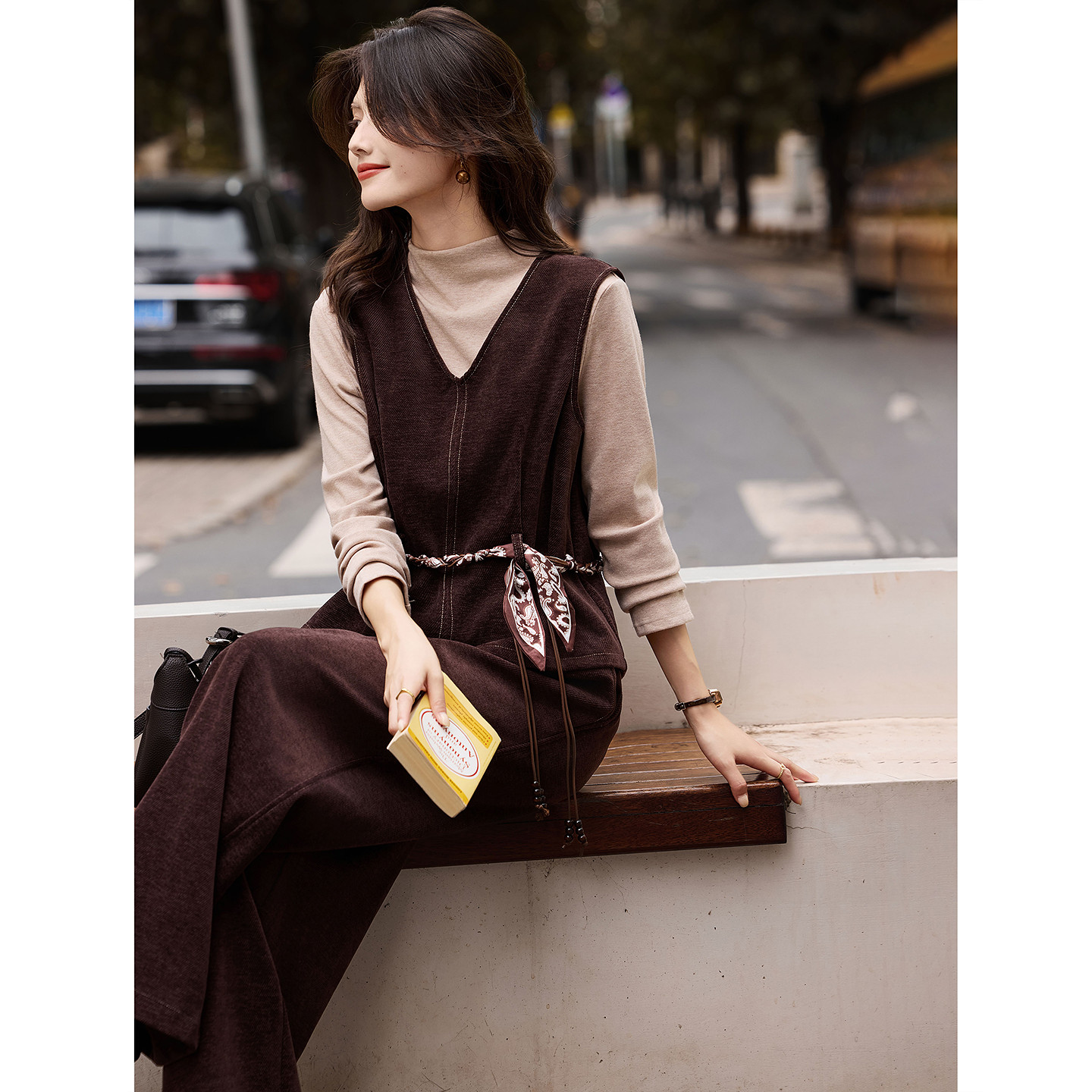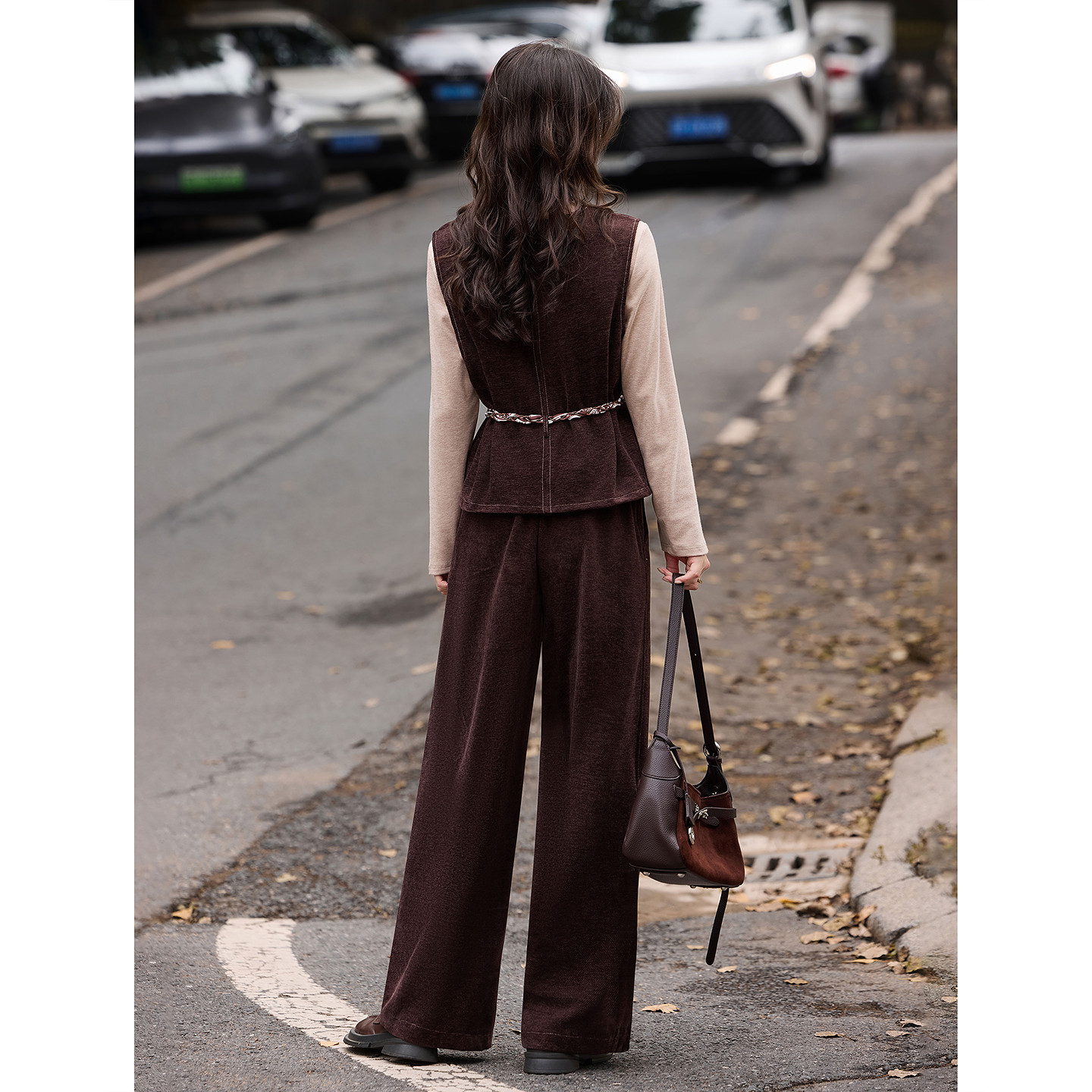 苏醒的乐园知性风三件套秋冬针织套头衫配腰带马甲阔腿长裤套装