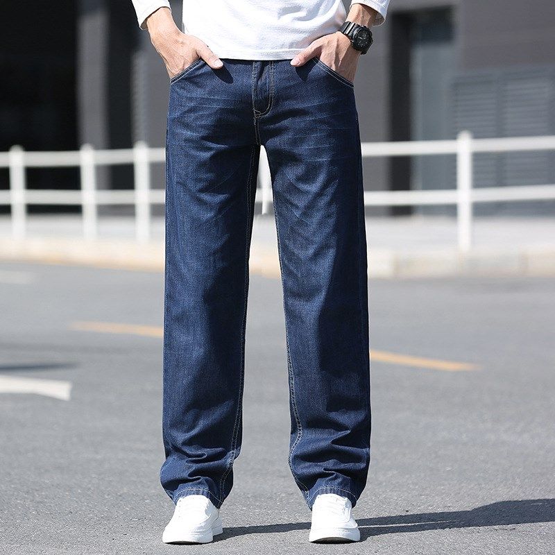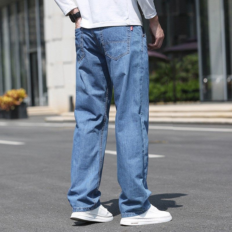 夏季薄款牛仔裤男宽松浅蓝直筒加肥加大码阔腿胖人男士休闲长裤子