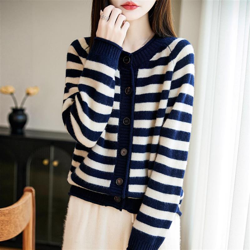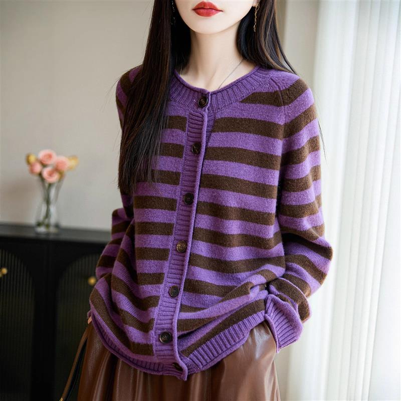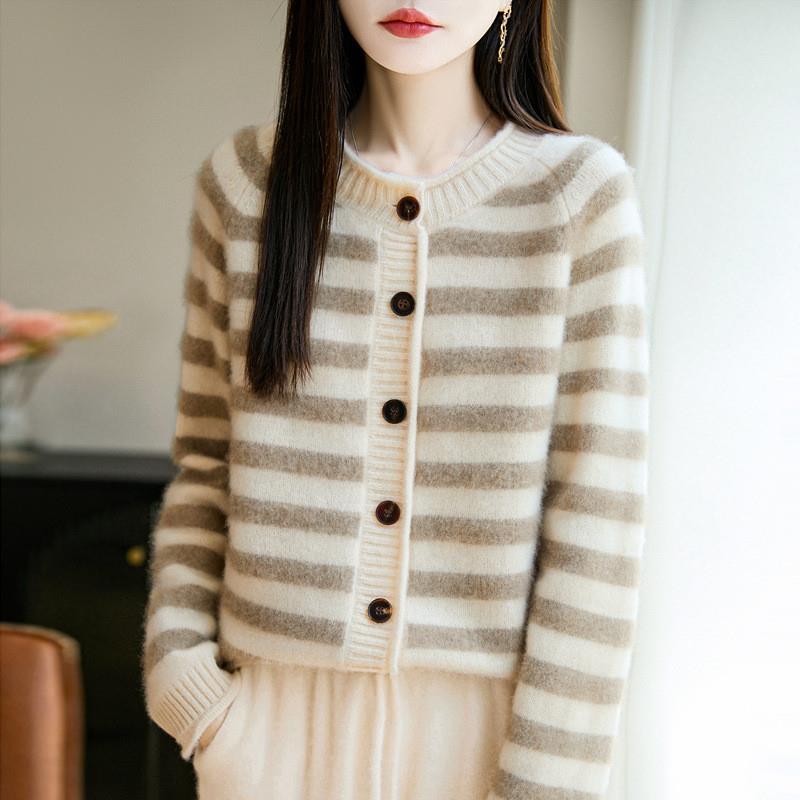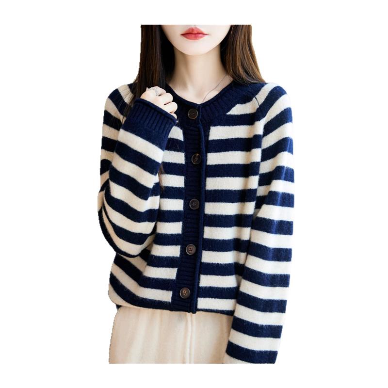 100纯羊毛衫七针加厚圆领针织开衫女式层次感间色条纹毛衣外套潮