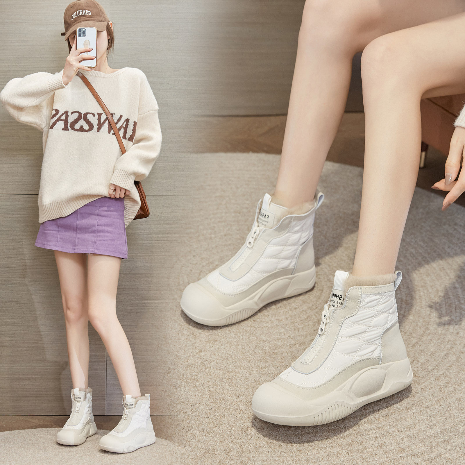 雪地靴女2025秋冬新款拉链加绒短靴子潮冬季休闲高帮厚底加厚