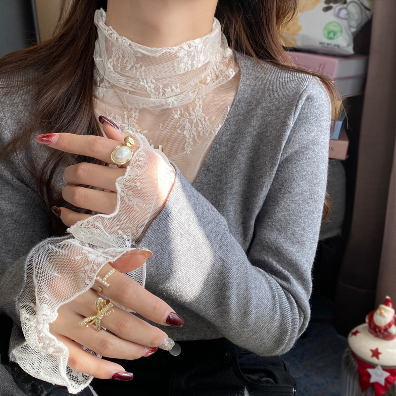 白色假两件蕾丝打底衫女内搭2025春秋季新款V领毛衣修身针织上衣