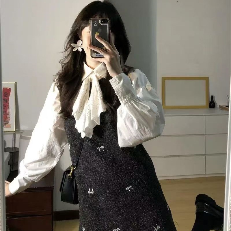 秋冬季两件套装法式复古风气质立领泡泡袖衬衫蝴蝶结背心连衣裙女