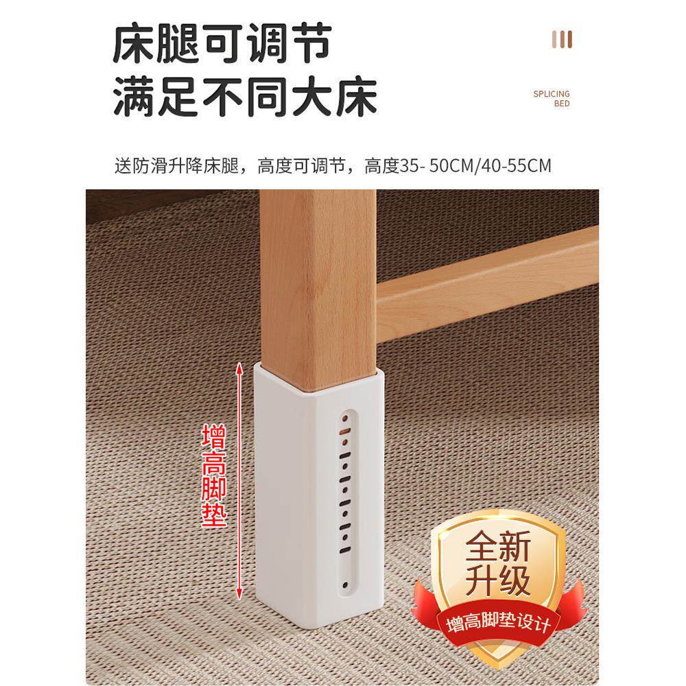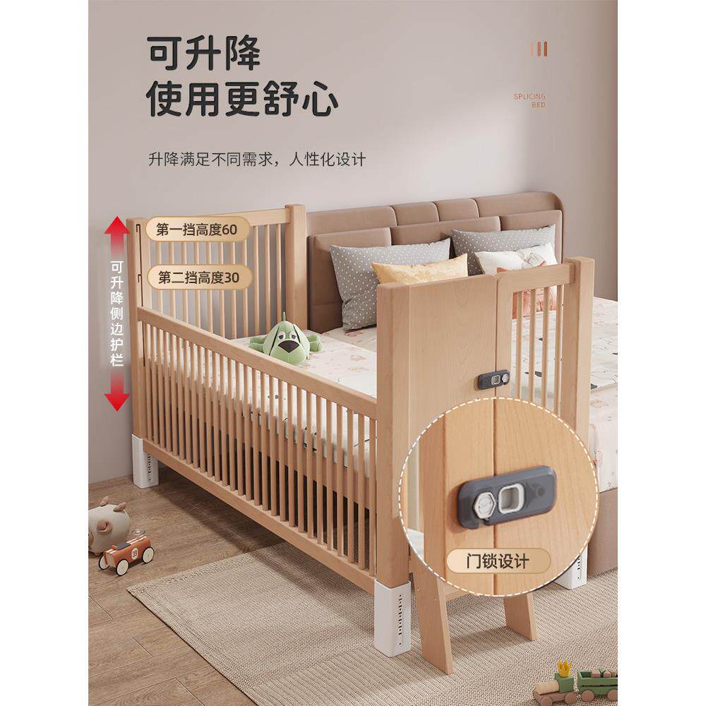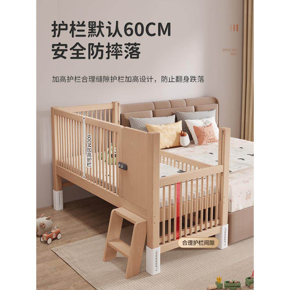 北欧轻奢儿童拼接床榉木加宽床边小床实木高护栏可调升降宝宝婴儿