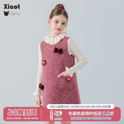 小童木 甜美小香风女童连衣裙冬季新款喜庆年服女大童花朵背心裙