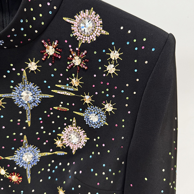 现货法式高端新款重工钉钻立领修身显瘦长袖黑色礼服连衣裙宴会裙