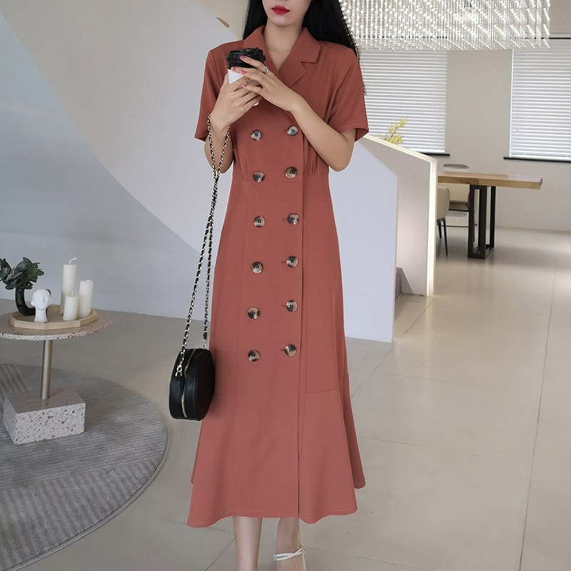 连衣裙女夏2023新款长款鱼尾收腰西装领短袖长裙气质显瘦长款裙子