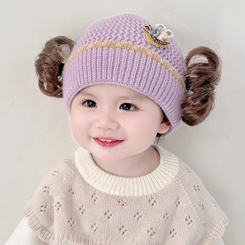 女宝宝帽子秋冬季假发毛线帽婴儿辫子针织护耳帽女童公主风套头帽